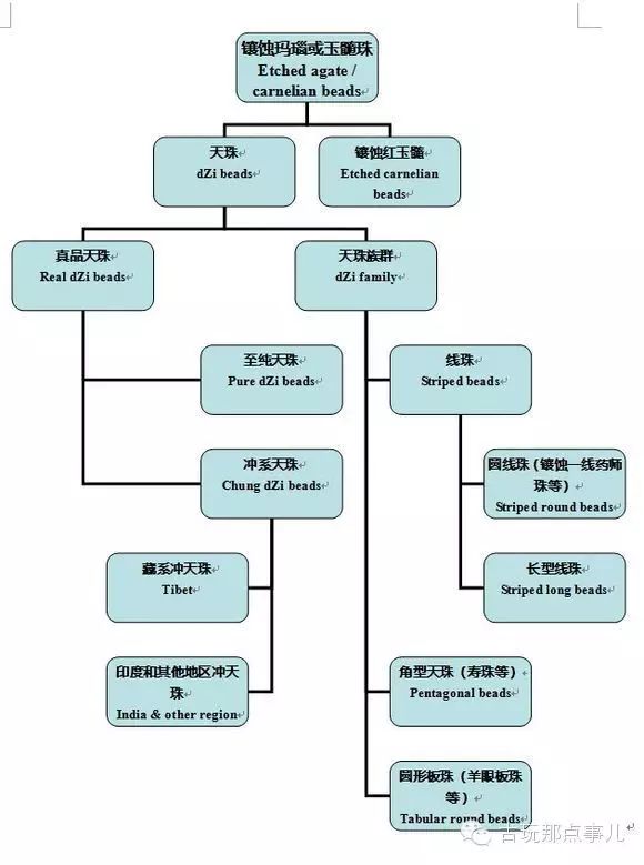 天珠族群,旁系天珠(dZi family),另有一些镶蚀玛瑙珠的制成年代,生产地域,工艺和材料上都和天珠有紧密联系,但是由于图腾和形制的差别,通常把这些珠子和主流的天珠区别开来,归为旁系天珠。一般包括的几种类型如上结构图所示。
