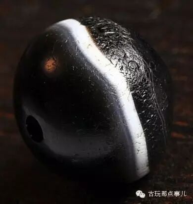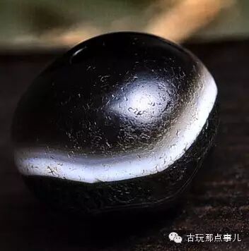 圆线珠,镶蚀一线药师珠。藏文音译“惹米”(注2),汉地俗称为药师珠。药师珠特指黑底白线扁圆形的一种珠子。一般分为两种,一种是天然药师珠,最近这种珠子很火,相信大家并不陌生,但是这种天然的珠子并不可列入天珠族群,在此不再赘述。我这里要说的一种是经过镶蚀的药师珠,也被人称作圆线珠,是在黑色和染成黑色的球形玛瑙珠表面人工镶蚀了一道白线的旁系天珠,此类珠子种类繁多,涉及多种天珠镶蚀工艺,收藏价值颇高。