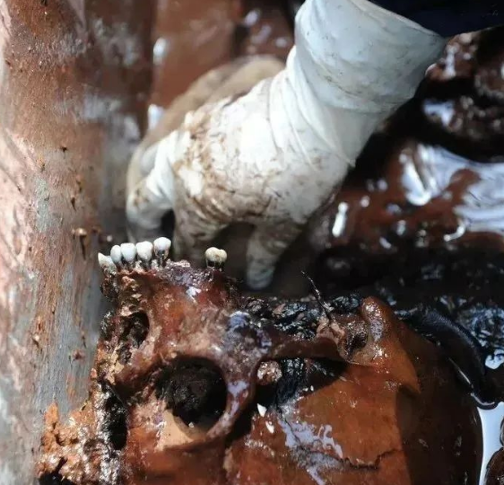 考古人员在清理六安战国墓北墓内棺里的头骨