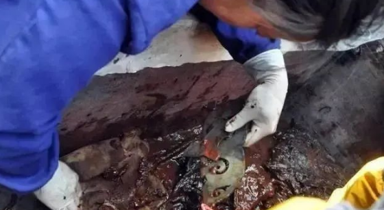 考古人员在清理六安战国墓北墓内棺里的陪葬品璜