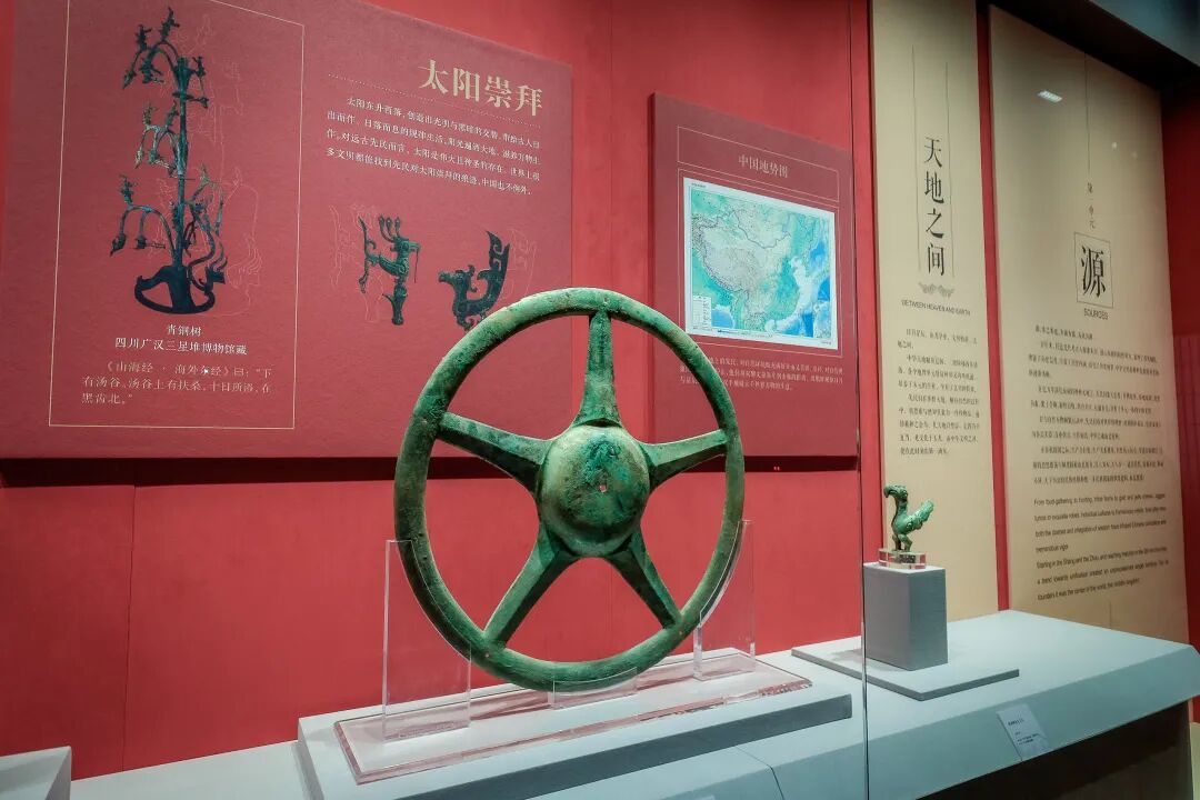 太阳东升西落,创造出光明与黑暗的交替,带给古人日出而作、日落而息的规律生活。阳光滋养万物生长。对远古先民而言,太阳是伟大且神圣的存在。三星堆博物馆馆藏——铜神树枝头立鸟与铜太阳形器作为此展的开篇文物,将先民的太阳崇拜向大家娓娓道来。