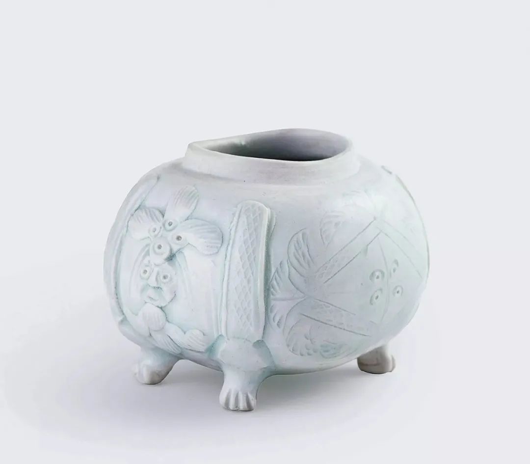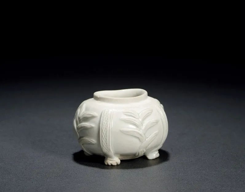 此件水盂造型独特,设计巧妙,通体为椭圆形,通体施白釉,胎质洁白,罐身贴塑花卉纹,底足呈兽足状,底足之上饰以绳纹,颇具唐代金银器特点,为邢窑仿金银器造型精品之作。 西安大明宫遗址曾出土与本件器物完全一致的标本,可见当时使用者路份极高。目前查阅公私馆藏收藏资料,仅见于2015年春,伦敦东方陶瓷学会会员收藏展中展出有一件相类作品,其余馆藏未见,足可见存世珍稀。