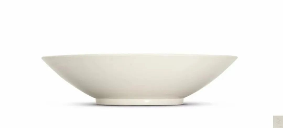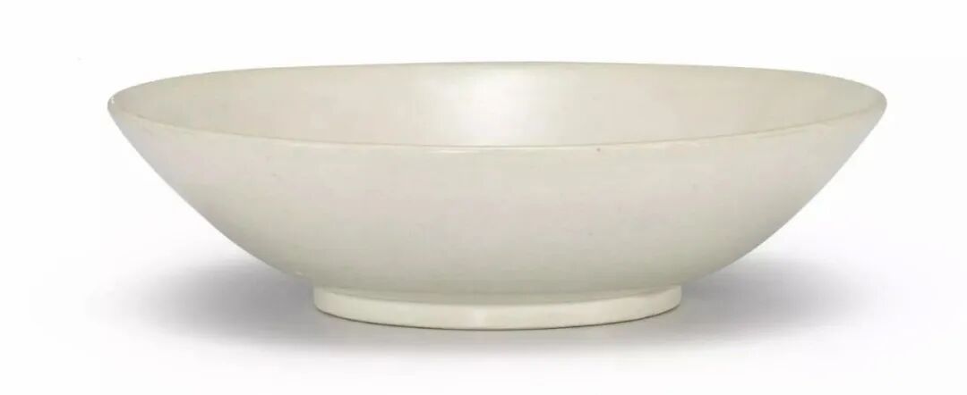 盘作五瓣花形,斜直壁、平底,足底无釉,倭角处内凹起棱。胎质细腻、胎体匀薄,透光见影。盘心以沥粉堆花工艺装饰衔枝雀纹,两只雀鸟展翅和鸣,纹饰凹凸有致,形象生动。花口盘的器形源于金银器,其采用的沥粉装饰亦忠实地模仿了金银器上锤碟浮雕纹饰效果,极富装饰美感。 邢窑拍卖榜第24名 唐 邢窑白釉钵