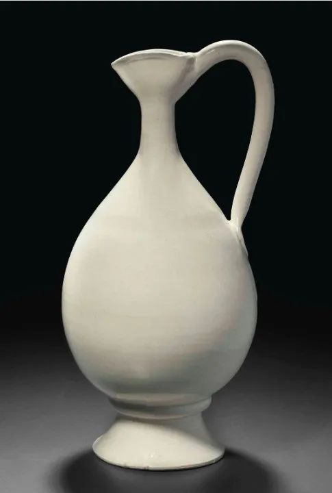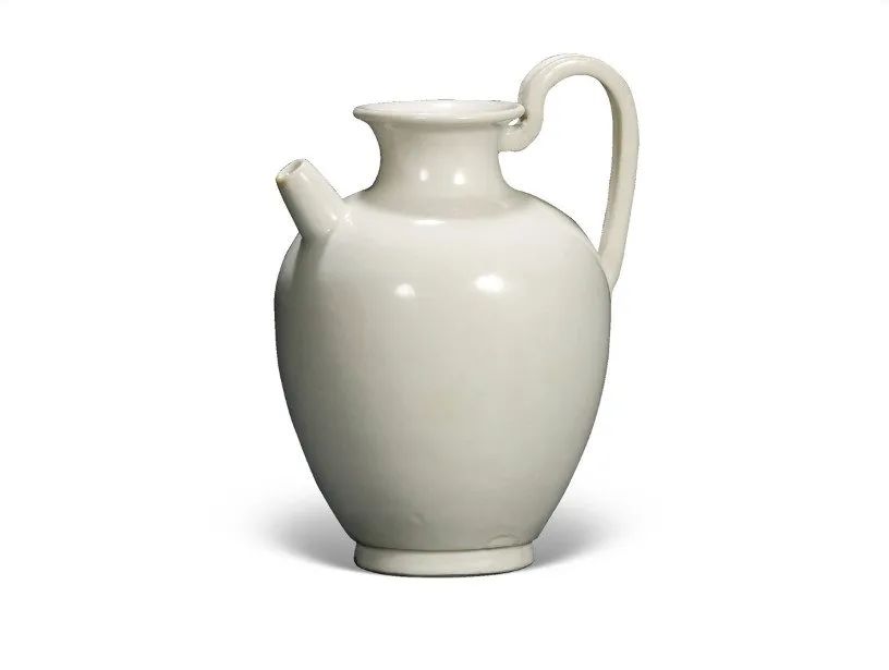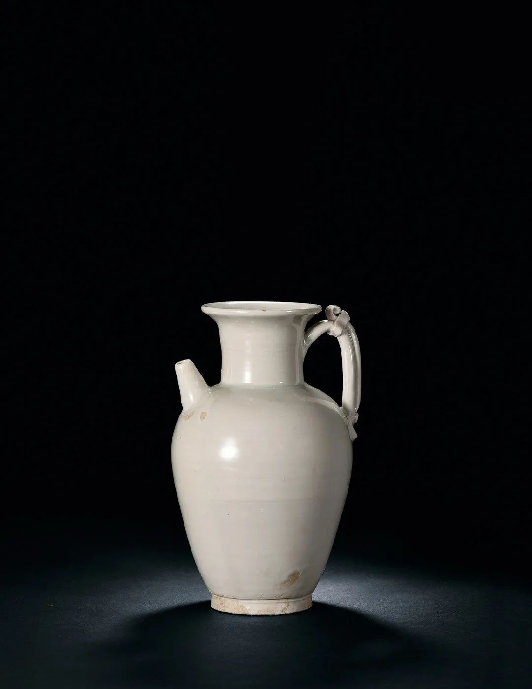 壶为敞口,圆唇,高束颈,溜肩。长鼓腹,向下渐收出圆饼状实足。肩部一侧出短直流,一侧出双圆泥条带状柄。通体施白釉,釉色微泛青,釉面细润,光泽感强。足底涩胎,胎白泛灰,质地细密坚硬,近足心处阴刻“盈”字款。整器制作较一般邢窑更为精细,造型端庄大方,为唐代邢窑代表作品,且品相保存完整,殊为难得。 邢窑拍卖榜第15名 晚唐 邢窑白瓷壶