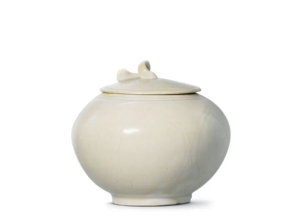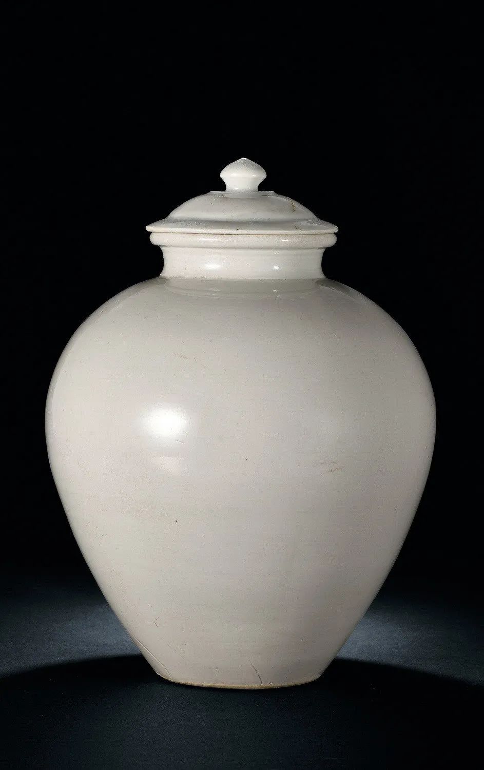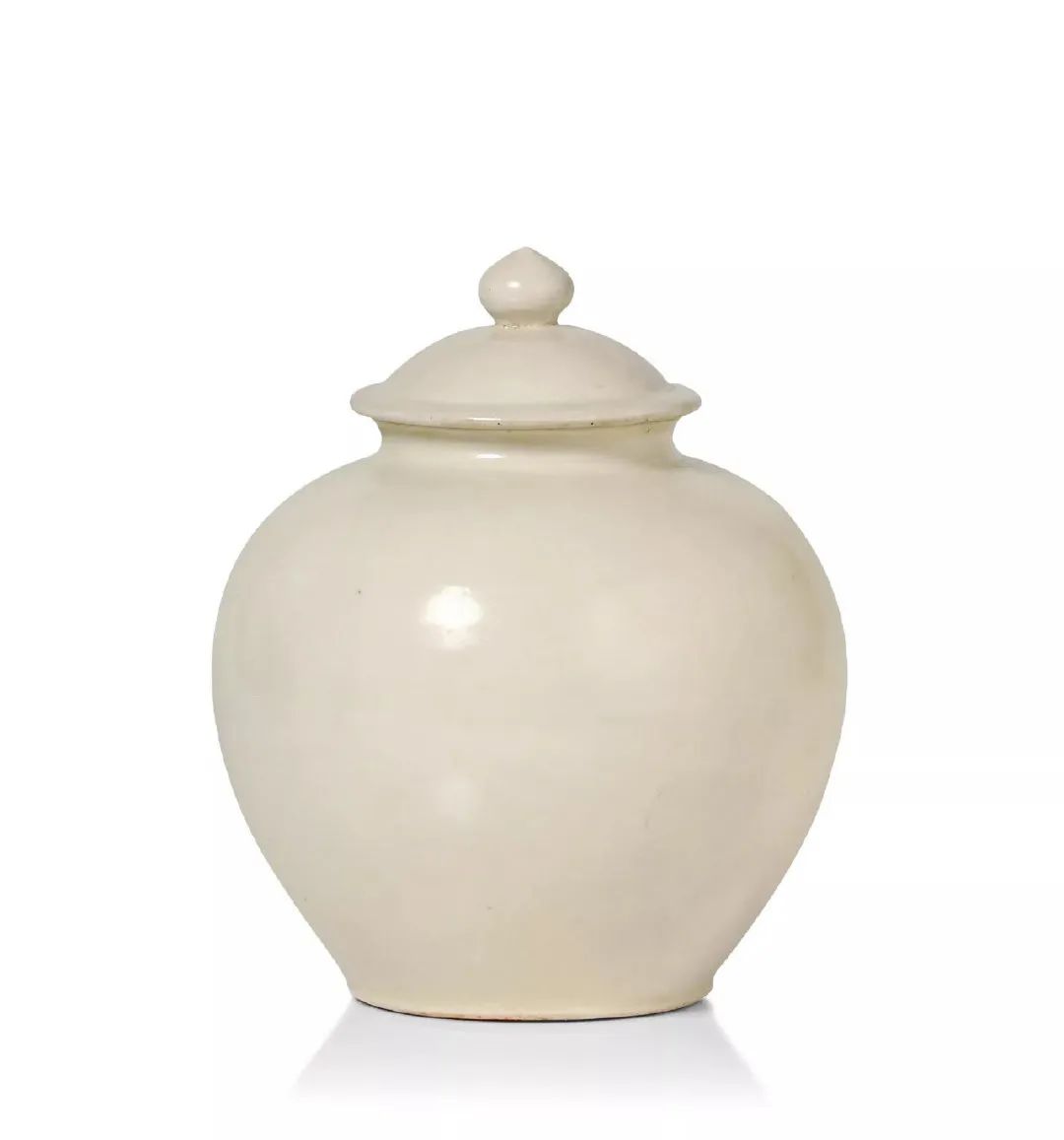 此件邢窑白瓷壶侈口长颈,前肩缘设短流,把柄有扣为穿系,肩部丰满,腹高而直,圈足,器形浑圆饱满,线条流畅,造型优美。该壶胎质致密坚硬,除足部外均施白釉,釉质均匀纯净,洁白光润,通体素净,盈润可人,全器清素简洁,规整典雅,给人以既雍容饱满而又凝重大方的美感,为白瓷之佳品。 邢窑拍卖榜第14名 元 邢窑白釉盖罐