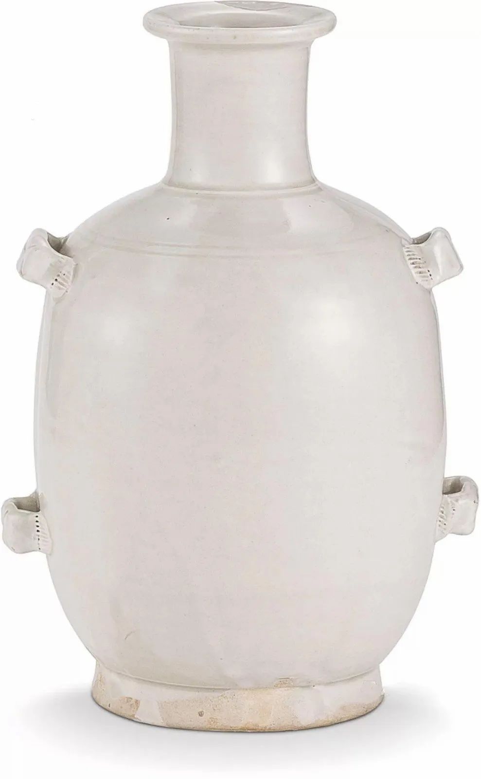 本品杯呈塑贴鹦鹉形,通体施白釉,鹦鹉其翼伸展成杯,小眼尖嘴,鸟首之上点褐彩装饰,以模仿真实鹦鹉之效,双足藏于器内,外翼以阴刻方式装饰羽翼,是具放生及实用结合器,混然天成。白釉莹洁雅致,造型古朴,同类传世极为罕有 邢窑拍卖榜第4名 五代至北宋 邢窑白釉四繋瓶