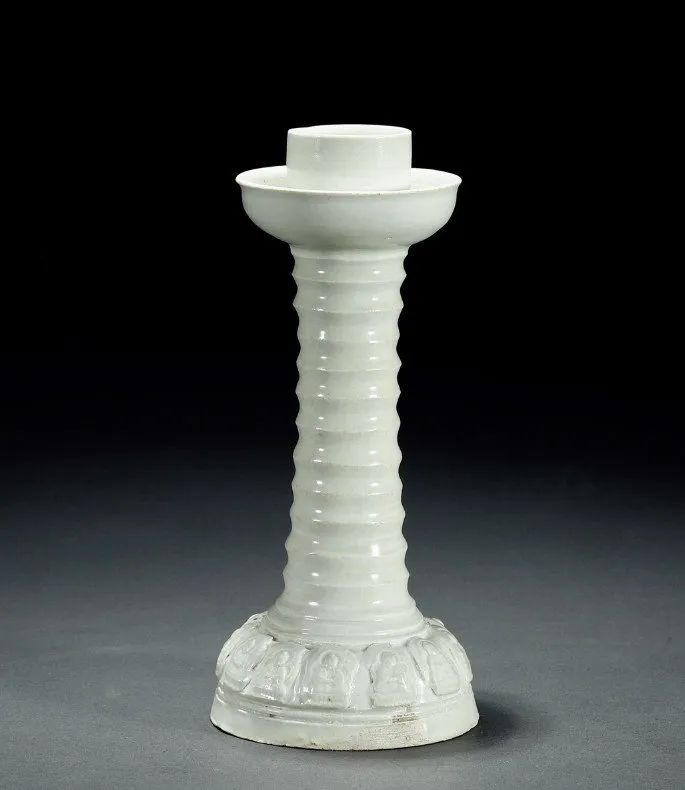 唐代 邢窑白釉皮囊式壶,北京故宫藏,平砂底,以行草书体刻划工匠名称“徐六师记”四字 邢州窑址位于河北邢台市所辖的内丘县和临城县祁村一带。邢窑白瓷的特点是造型落落大方,线条流畅,制作规整,釉色牙白恬静,从陆羽《茶经》里的评价“邢瓷类银,越瓷类玉”,“邢瓷类雪,越瓷类冰”更可见一斑。 邢白又分为粗白瓷和细白瓷,底款常见有“盈”字款、“翰林”款,可见当时邢窑白瓷也是为官方制瓷的。 新中国建立之后,各地窑口陆续复苏,邢窑也不例外,经专家日夜攻克,邢窑在它古代主要产地临城县被仿制成功,从此千年名瓷重新放出迷人的光彩。 唐代 邢窑白釉蹲狮,临城县中羊泉村出土,河北博物院藏 同为高古瓷,邢窑瓷拍卖价格远没有宋代五大名窑之高,但是邢窑瓷业具有很大的收藏价值,由于邢窑几乎全部都为出土瓷,因而是比较容易辨别真伪的,但是哪些邢窑瓷价格高,哪些最值得收藏,今天这篇史上拍卖价格最高的30件邢窑瓷,看完之后,藏家一定会心里有数。 邢窑拍卖榜第30名 唐 邢窑白釉贴塑佛像烛台 估价:RMB 40,000-60,000 成交价:RMB 63,250 拍卖会:西泠印社2019秋季十五周年拍卖会 专场:中国首届宋元瓷器专场 时间:2019-12-15 尺寸:高23.6cm 烛台为唐代陶瓷中常见的品类,唐三彩及白釉瓷器中均有此类型。此灯台造型端庄匀称,台柱饰多层弦线,足座贴塑佛像一周,此工艺在烛台中极为罕见。整体器形秀美,装饰华美,釉色匀净素雅,是唐代邢窑白瓷经典。 邢窑拍卖榜第29名 唐·邢窑贴塑草叶纹水盂