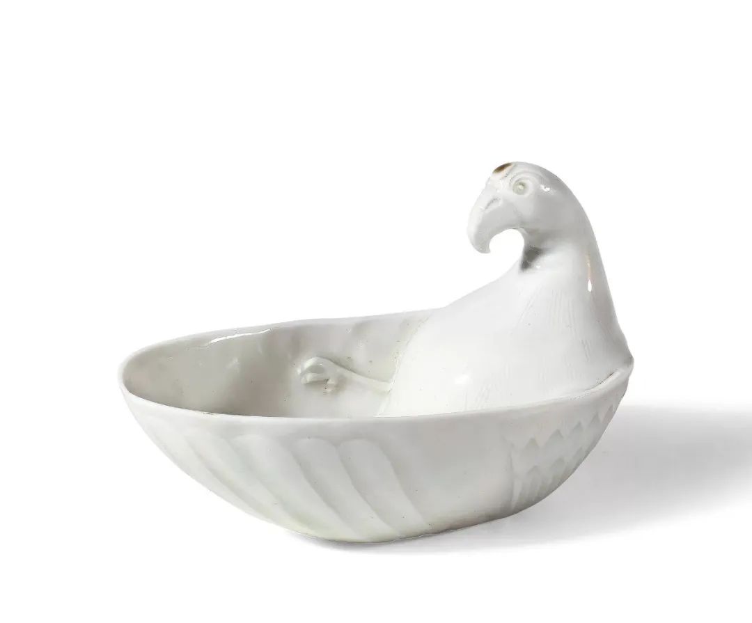 杯呈塑贴鹦鹉形,其翼伸展成杯,小眼尖嘴,双足藏于器内,外翼略有细节,是具像及实用的结合器,混然天成。通体施白釉,莹洁雅致。