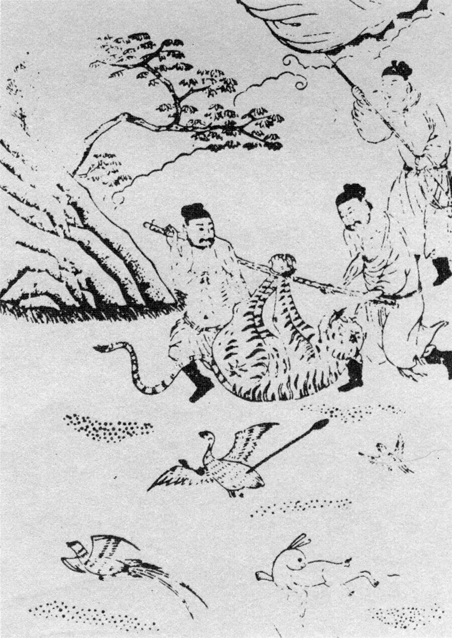 按照《述异记》中的观点,什么样的人会变成虎呢?“人无德而寿则为虎。”以今天的说法,就是那些“变老了”的坏人,最容易化虎。如清代东轩主人所著的《述异记》(跟前面的《述异记》并非同一本)里说,康熙年间,广西柳州来宾县“有一村民,每日早出晚归,必携死猪羊鹿犬等物至家,以为常”。后来他的儿子要娶媳妇,需要猪羊祀神,他的老伴叮嘱他最好能买到活物,见他面露难色,老伴心中起疑,“疑已前之物皆属偷盗”,便让儿子尾随在他身后观察。“至一山,见其父入岩洞中,少顷有虎咆哮而出。”儿子吓坏了,以为父亲一定已经命丧洞中,等老虎走远了,冲进洞去,只看到父亲的衣服。他退出洞去,正在困惑不已,却见那只老虎回到洞里,片刻,父亲衣装齐整地走出洞来。“其子骇甚,因急归告母。”父亲归家一看母子俩的神色,知道自己的秘密已经被他们看穿,便说“吾为汝等识破,今出不复返矣”,说完向外面走去。老伴拉着他的衣服不让他走,被他挣脱,只扒掉他的一只袜子。后来他的儿子在山中遇到一只老虎,其中一只脚是人足,“因思此虎必其父”。![]()