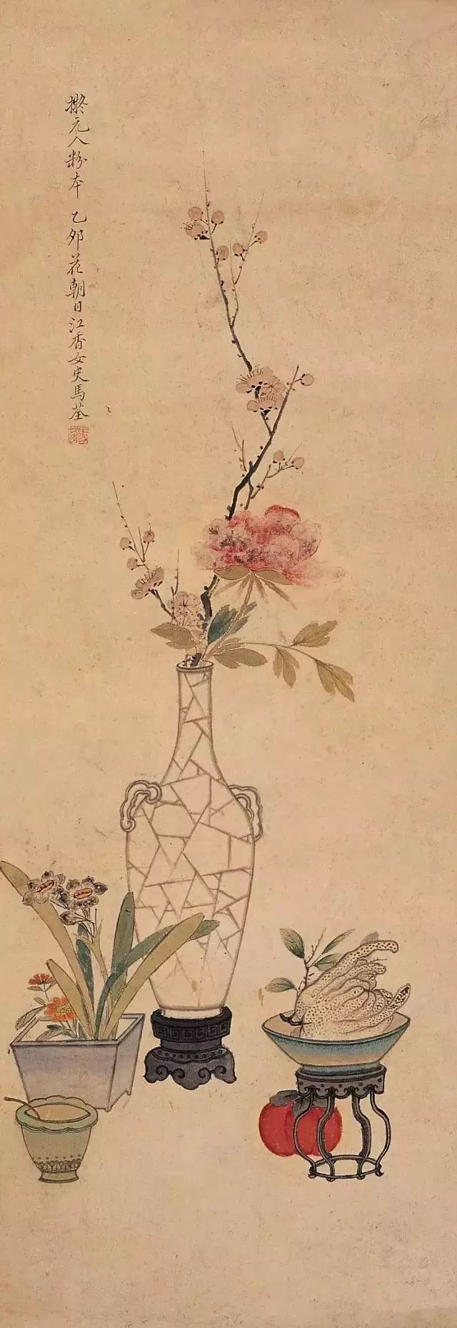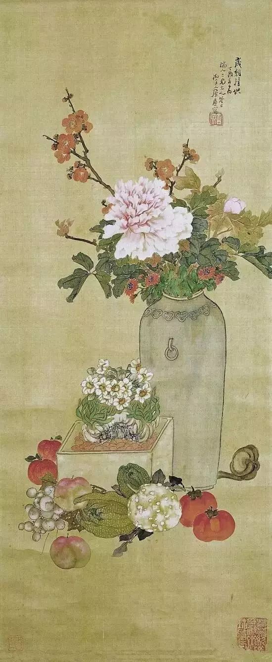“岁朝”即一岁之始,指农历正月初一。是日,以鲜花、蔬果、文玩供于案前,以求新年好运、春意盎然,被称为“岁朝清供”。《岁朝图》顾名思义,就是为庆贺“岁朝”所作之图,它通常以静物画的面貌出现,并配以贺岁诗词。通过画中物品的名称谐音、民俗寓意或历史掌故,来传达美好的新年祝福。
