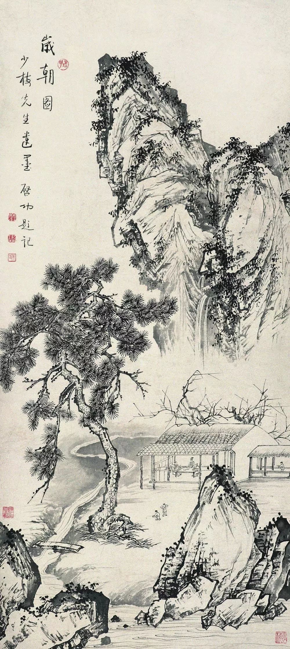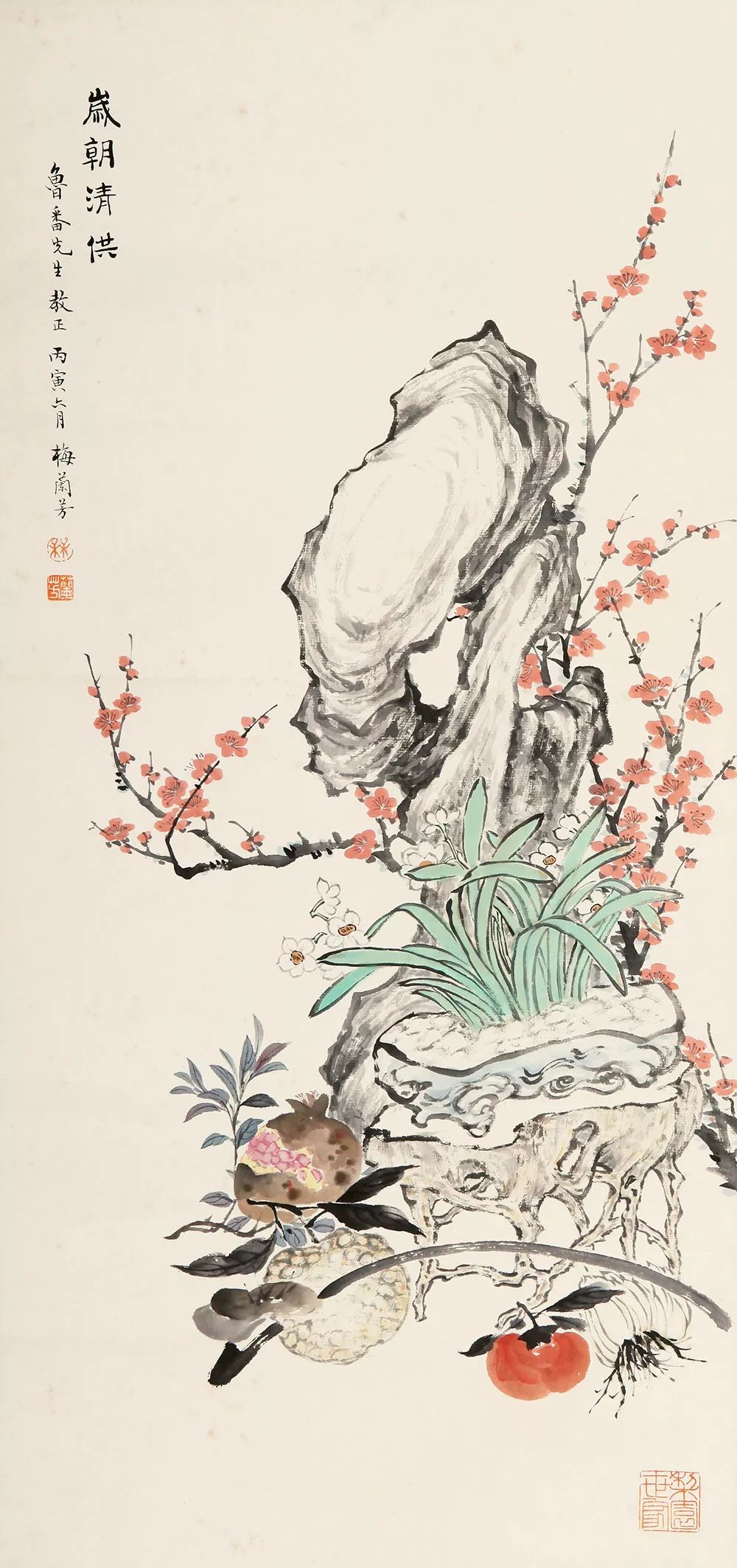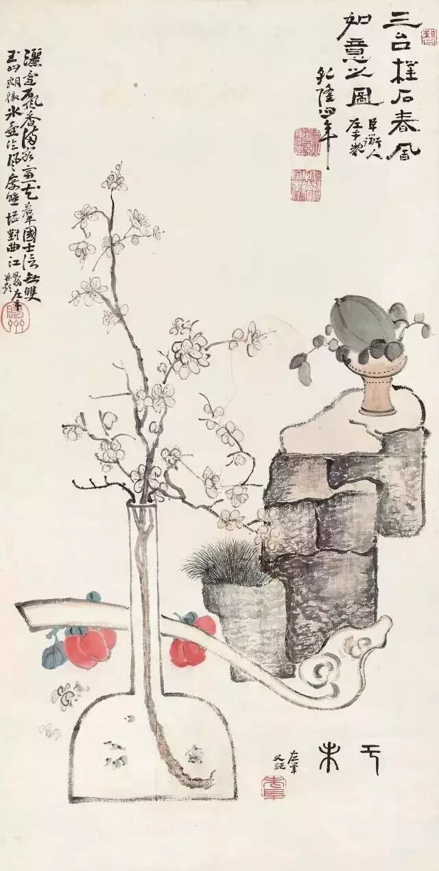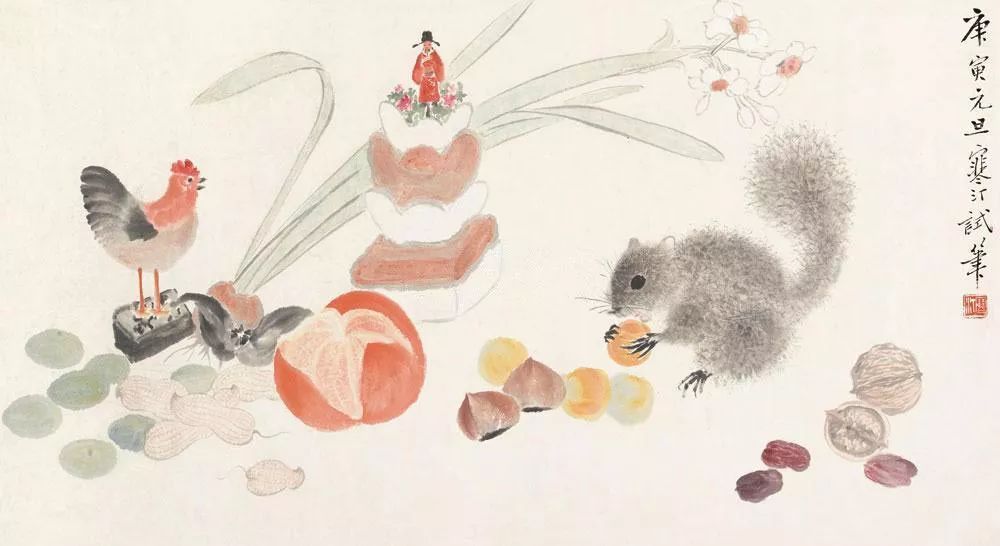此后,岁朝图的内容逐渐扩展,经明、清而至近现代,大至文房器物,小至灯笼、鞭炮、果蔬等日常生活用品,都成为图上的吉祥物,日益成为一种雅俗共赏、意蕴丰厚,融诗、书、画、印于一体的画种。