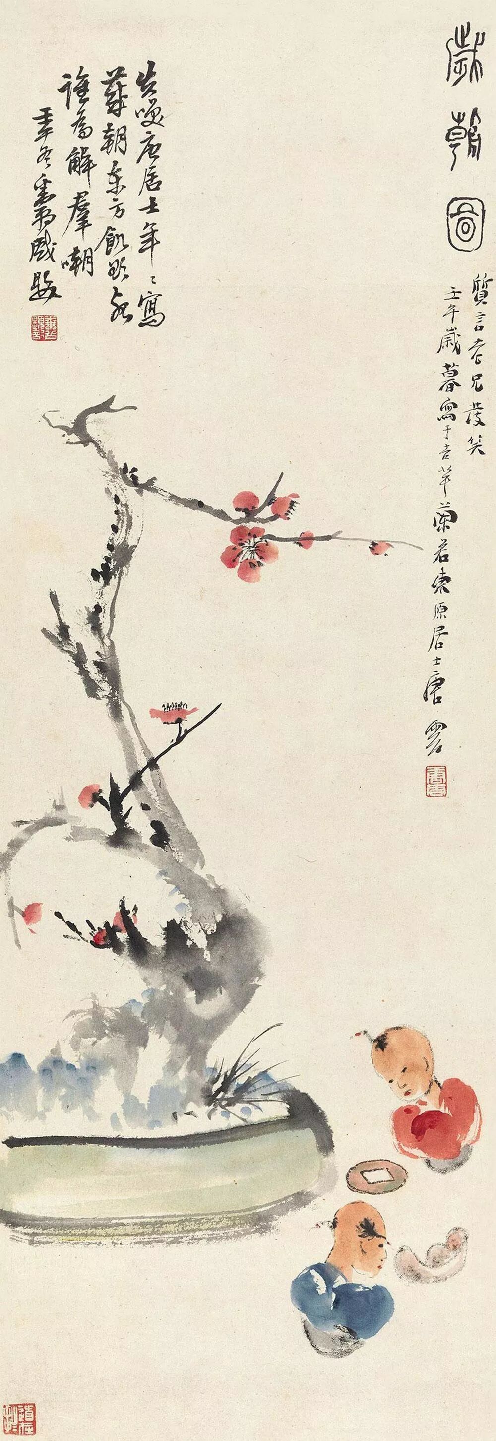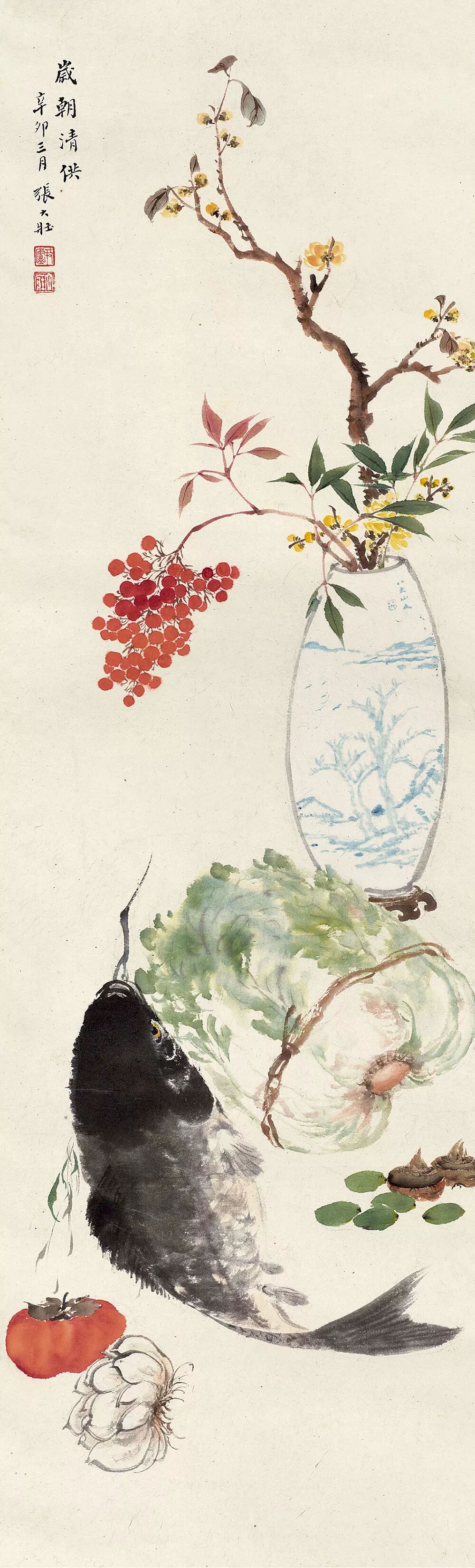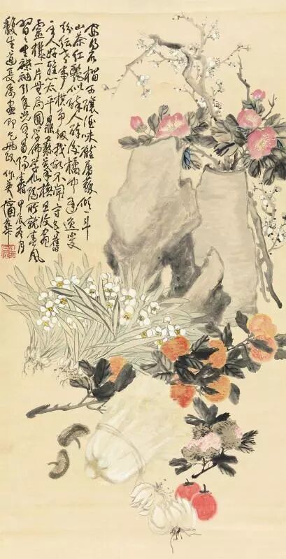此后,岁朝图的内容逐渐扩展,经明、清而至近现代,大至文房器物,小至灯笼、鞭炮、果蔬等日常生活用品,都成为图上的吉祥物,日益成为一种雅俗共赏、意蕴丰厚,融诗、书、画、印于一体的画种。