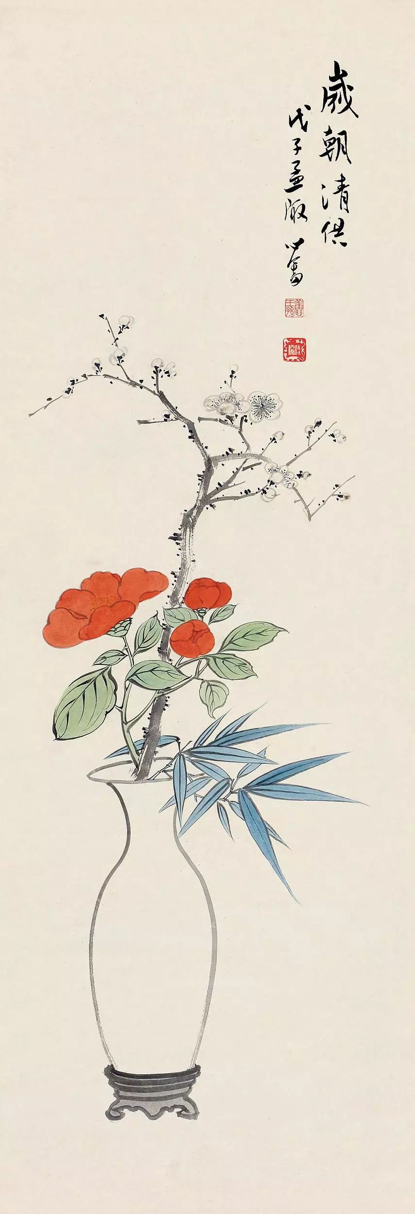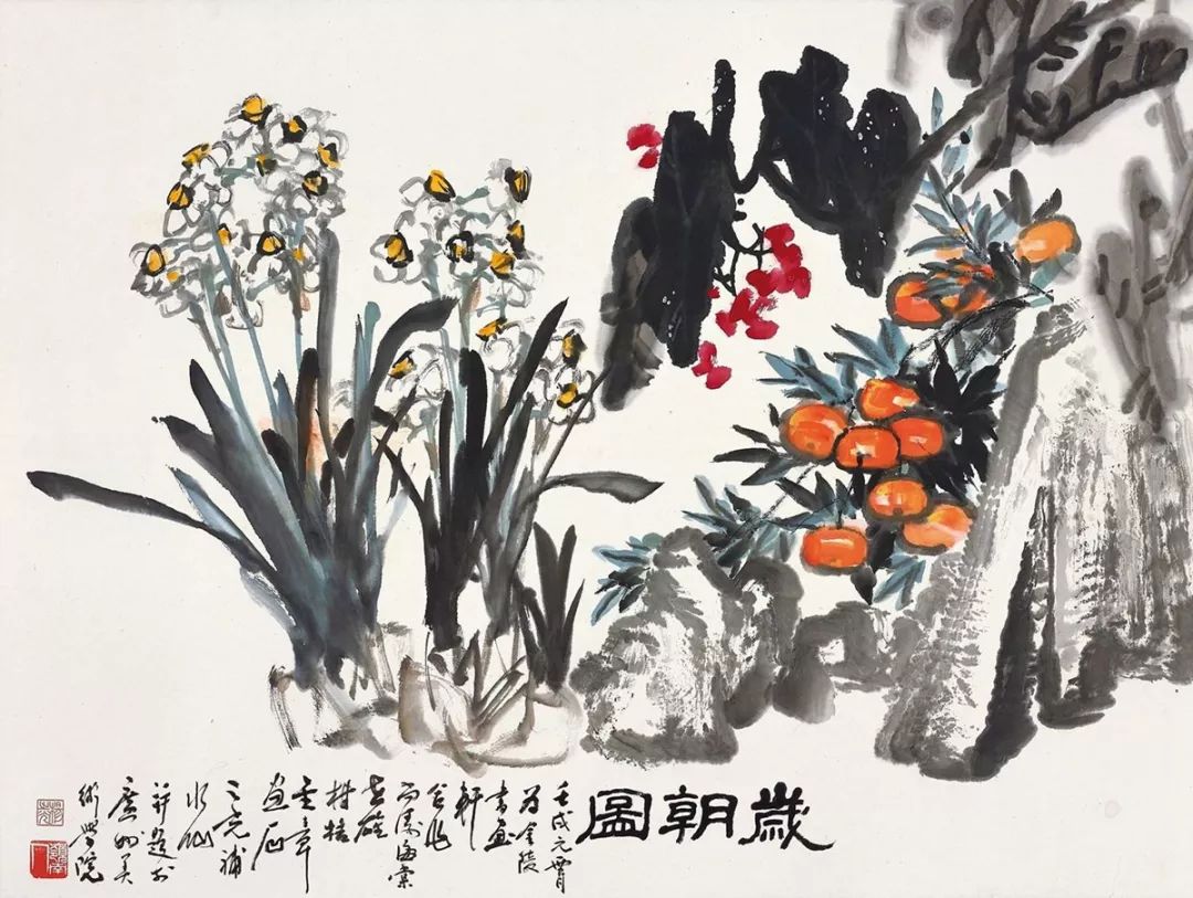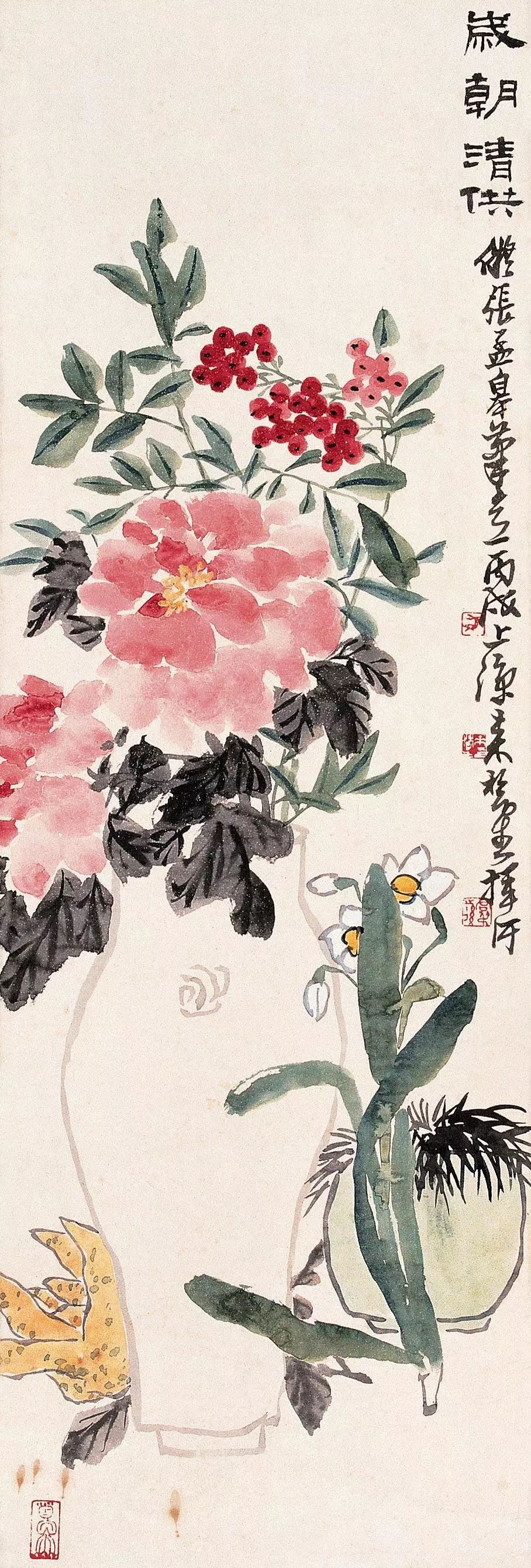 “岁朝清供”是中国画家爱画的画题。明清以后画这个题目的尤其多。任伯年就画过不少幅。画里画的、实际生活里供的,无非是这几样:天竹果、腊梅花、水仙。有时为了填补空白,画里加两个香橼。“橼”谐音圆,取其吉利。水仙、腊梅、天竹,是取其颜色鲜丽。隆冬风厉,百卉凋残,晴窗坐对,眼目增明,是岁朝乐事。