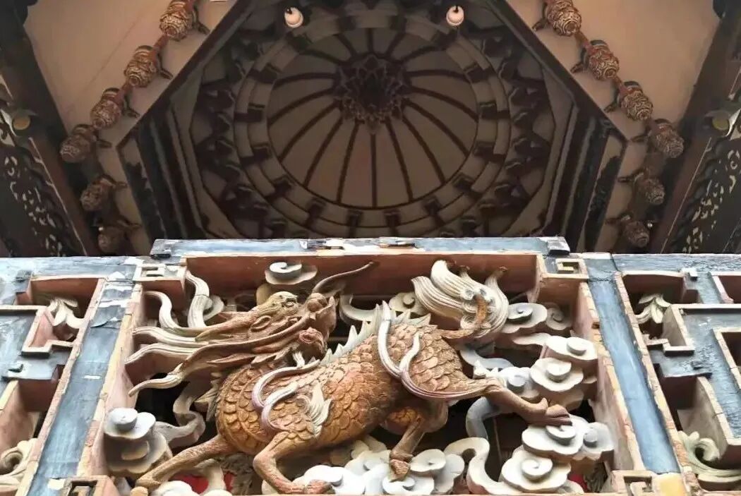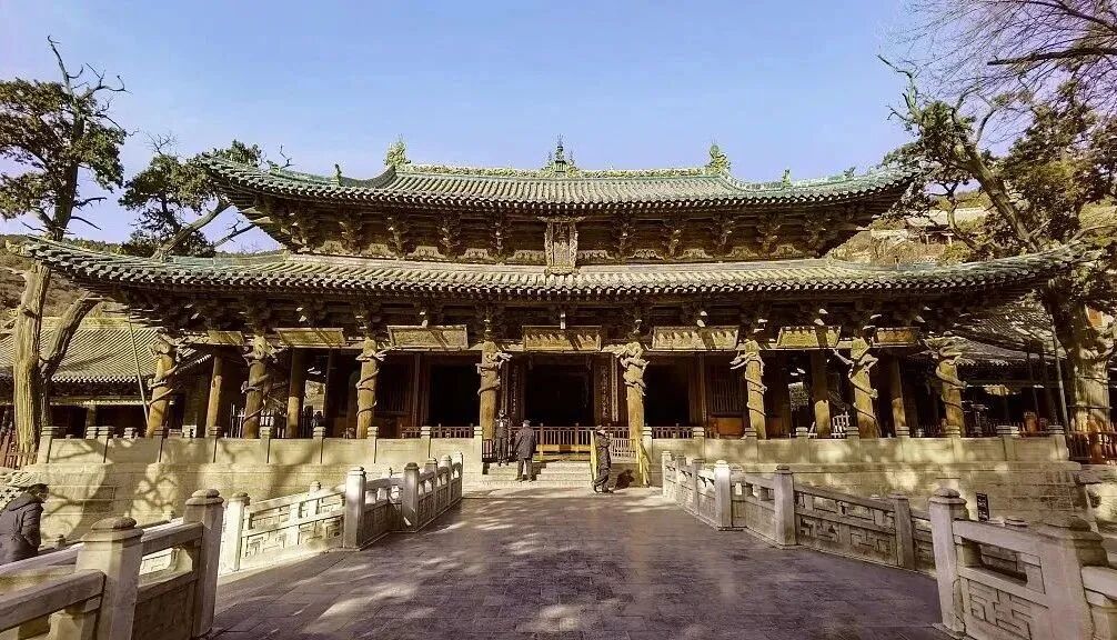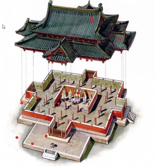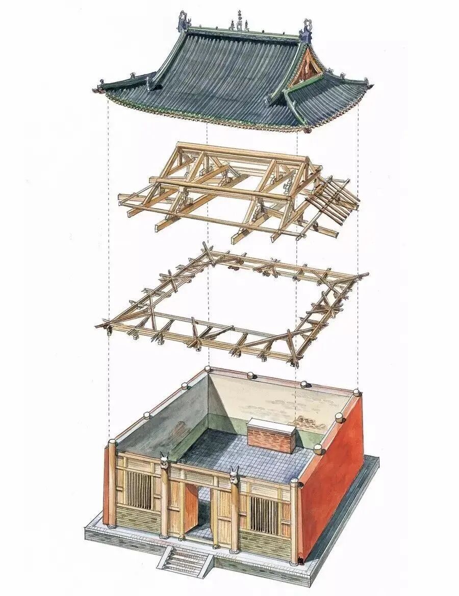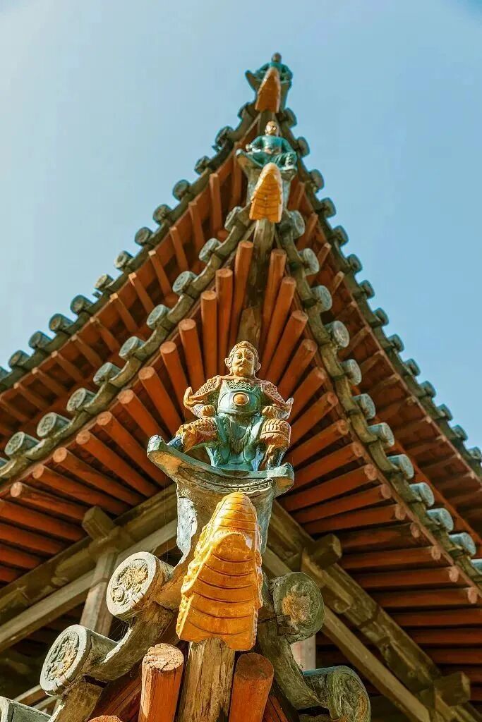 延庆寺大殿从汉发展到明清时期,屋顶形式已发展成熟,根据伦理等级划分出的:五脊庑殿(多用于重要的宫殿)、九脊歇山顶(多用于园林、坛庙)、悬山顶(多用于民居)等样式。它们可以互相混合发展,重叠成多层重檐、加腰檐或披檐。