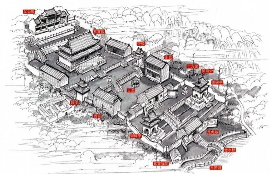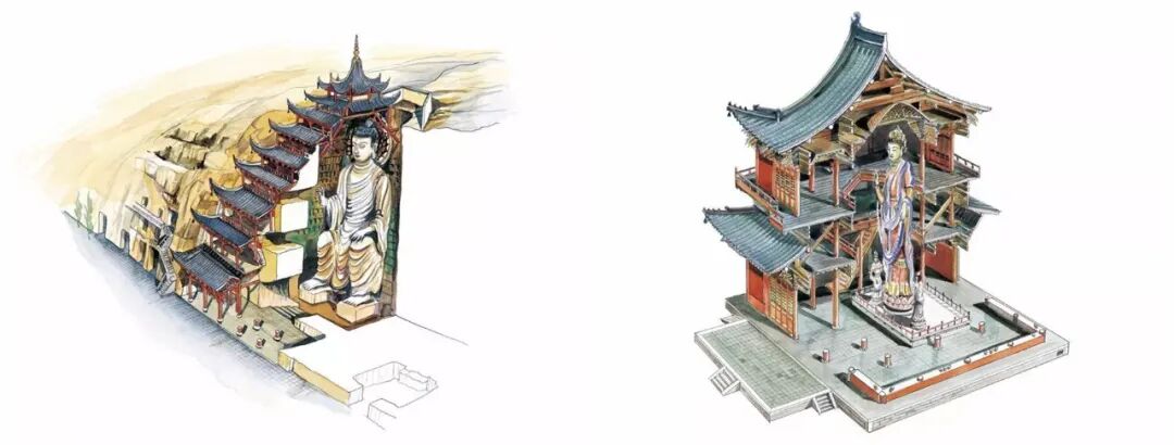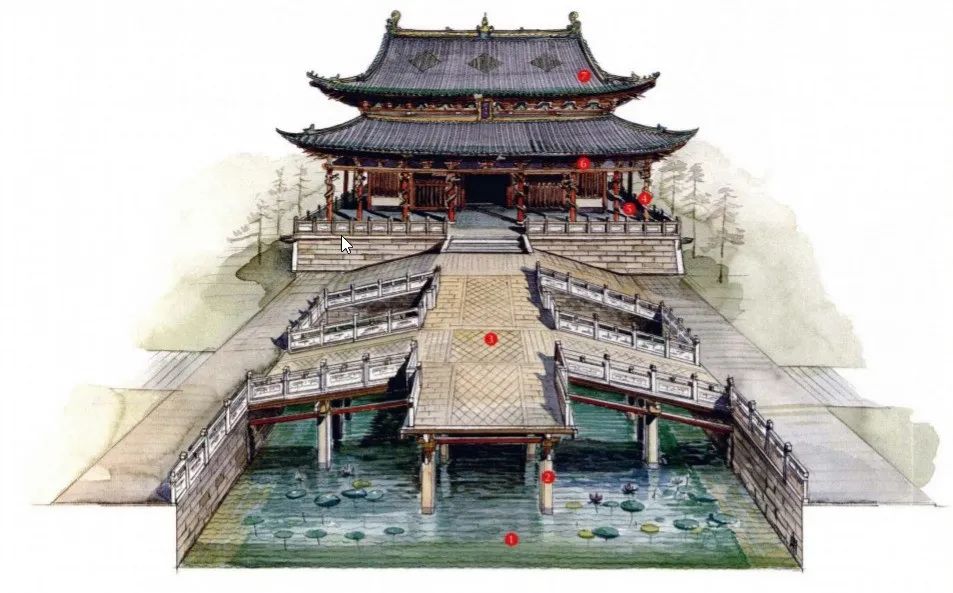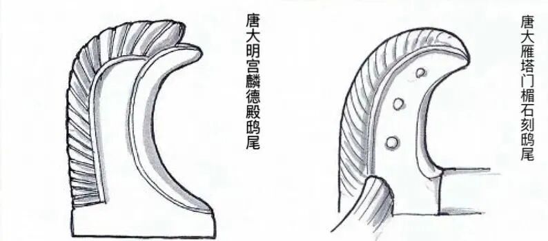 在描绘一座座大型建筑体之时,同时不忘进行细节描绘。晋祠圣母殿以凤凰为主题的宝座及屏风、唐大明宫麟德殿鸱鸟尾、金朔州崇福寺弥陀殿龙,都被清晰展示出来。