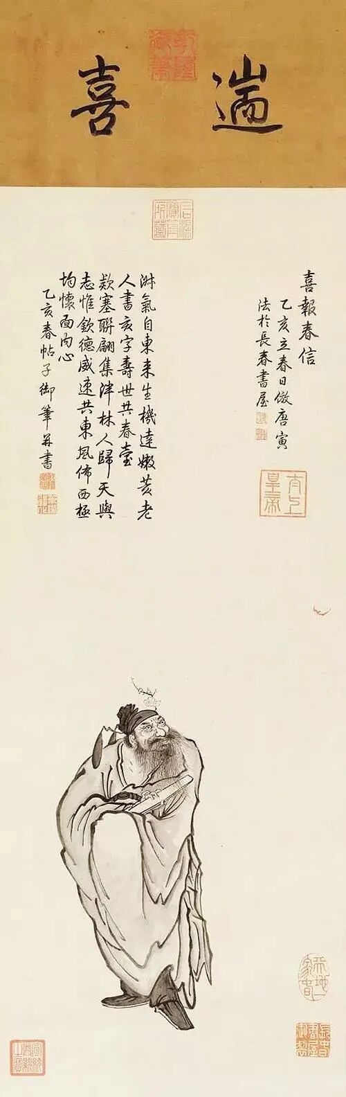 这是乾隆44岁画的《岁朝图》,题为“喜报春信”。此作乾隆皇帝以锺馗表达祛魅、辟邪之意,以红蝙蝠来寓意洪福之意。