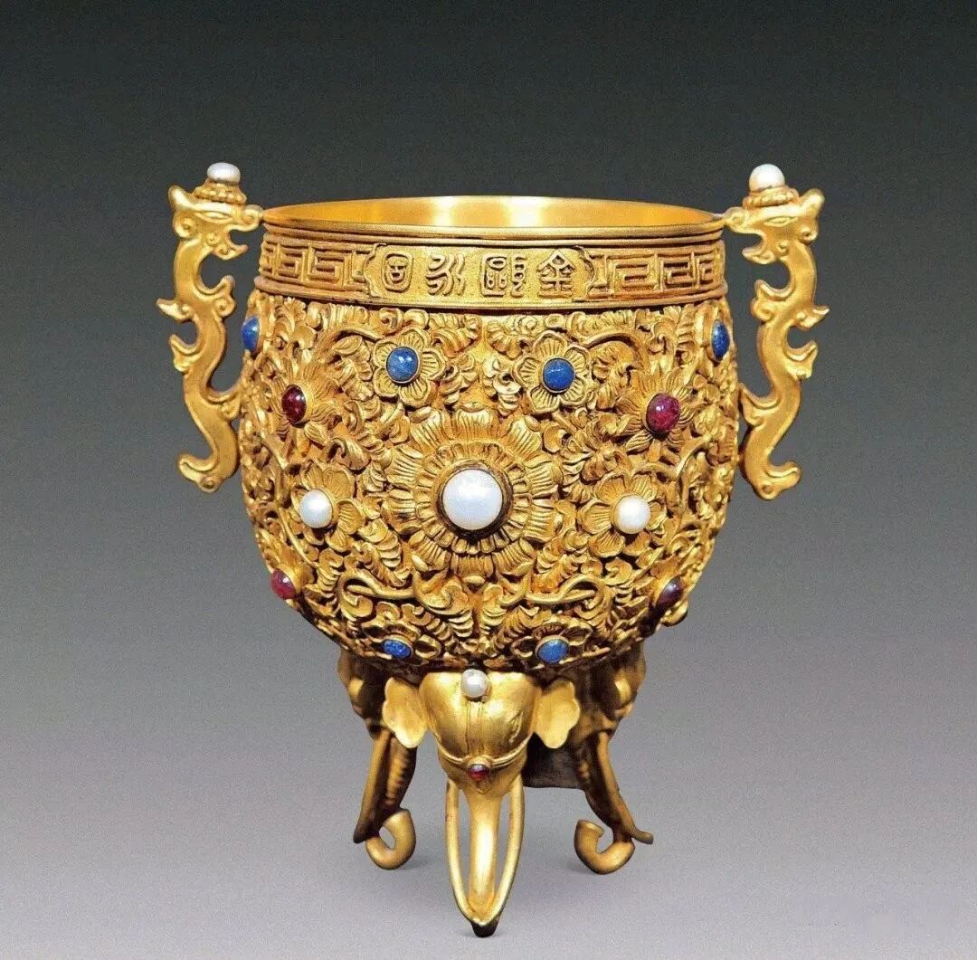 到了乾隆皇帝时,形成了一套十分严格、程序复杂的元旦开笔仪典。时间上必须在元旦子时;地点在养心殿东暖阁的明窗下,窗前摆放紫檀长案,所以也称“明窗开笔”;案上陈设金瓯永固杯,寓意大清的疆土、政权永固,杯中斟满屠苏酒。金瓯永固杯便成为清朝历代皇帝元旦开笔时的专用酒杯;案上置朱漆雕云龙盘,内盛古铜八趾吉祥炉和两个古铜香盘;皇帝亲燃“玉烛长调”烛台蜡烛,将万年青笔管在炉上微熏,笔端曰“万年青”、笔管镌“万年枝”;此时太监已经将墨研好,皇帝先用朱笔在黄纸的中行书写,然后再用墨笔书写左右行。内容多是祈求国泰民安、社稷永固的吉语,写好后,皇帝将金瓯永固杯中的屠苏酒一饮而尽;太监们将皇帝写的吉语放在专用的黄匣内封存,不许任何人拆看,下年开笔所写仍放入该匣内,年年如此。