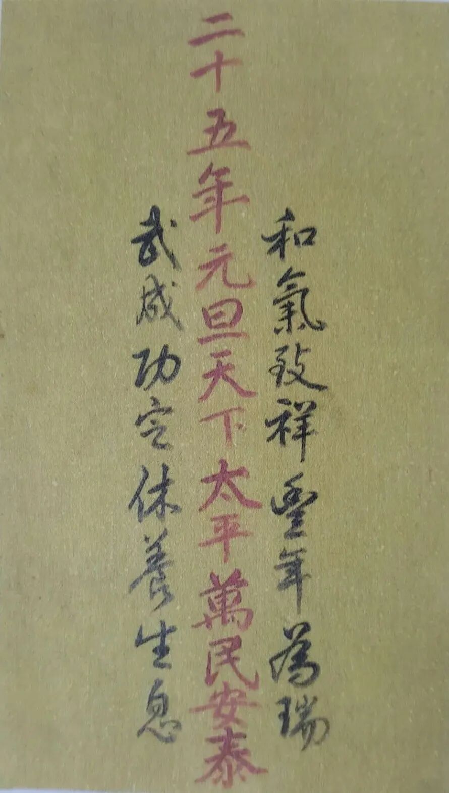 乾隆二十五年(1760年),好大喜功的乾隆帝志满意得、沾沾自喜,未免有些飘飘然。这一年元旦,他先用朱笔在一张黄纸的中行写道:“二十五年元旦,天下太平,万民安泰”;然后用墨笔在右、左行分别写道:“和气致祥,丰年为瑞”、“武成功定,修养生息”。从中流露出乾隆大功告成、骄傲自满的心情。他在之后30多年的皇帝生涯中,元旦开笔写的最多的吉语就是:“宜入新年,万事如意,三羊开泰,万象更新,和气致祥,丰年为瑞。”多是粉饰太平、歌功颂德的语言,少了一些进取之心。乾隆因喜欢写诗,举行完开笔仪式后还有诗作。