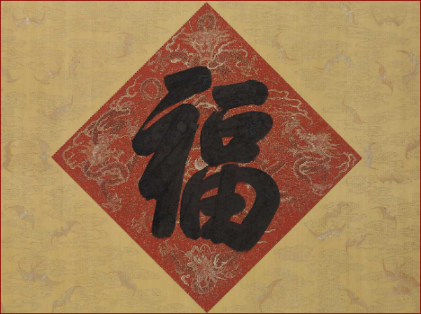 在故宫博物院藏有一幅慈禧太后的《“福禄寿”三字》轴。慈禧题写的这个福字别出心裁、独具一格,其实是由三个字以象形的手法组成,它们互借偏旁、互相依托,形成一体。中间空白处画成一个寿星拄着拐杖,整幅字犹如一件绘画作品,可谓构思巧妙、布局新奇。右上款为慈禧自题“光绪戊子新正御笔”,即清光绪十四年(1888年)正月初一,这一年慈禧太后54岁,钤印三方,中间最上方为“慈禧皇太后之宝”;左上款为曾任翰林学士、户部左侍郎的吴树梅题七绝诗一首:“一曲山香白雪高,玉清新赐绛绡袍,金堂玉宝如仙篆,定拜金盘五色桃。”近代诗人夏仁虎有清宫词《赐福字》描述了清宫御笔书福之俗:“年年腊朔御重华,赐福苍生笔有花。御墨龙笺书福字,近臣分载福还家。”