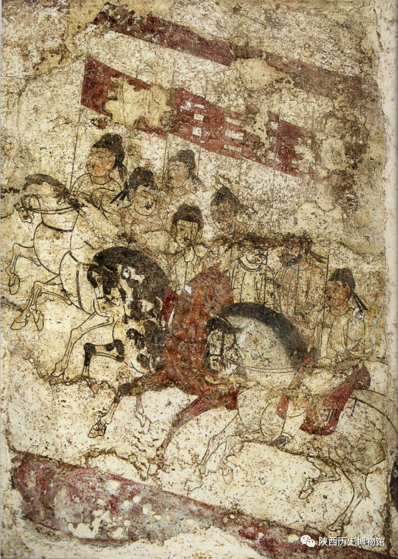 李寿墓墓道西壁骑马出行图保存较东壁稍好,揭取时分成五块,为第三组中的第一列(一人)、第二列(二人)、第三列(八人)和第四列(八人)。图中骑士均头戴黑色幞头,身穿白色或淡黄色圆领紧袖戎衣。缚绔,腰系黑带,足穿黑靴,左手勒缰,右持四旒红旗。人物形态和面部表情各不相同,有的正面,有的左侧面,有的右侧面,有的面容丰润,有的瘦削,有的为深目高鼻长髯的胡人形象。马的描绘和刻画更为生动传神,从颜色上看,有白马、棕马、青灰马、黑色白蹄马。马鬃有的修剪整齐,有的蜷曲下披;没有花或绺,尻尾也未结椎。马头小,胸腹紧劲,尻圆,腿细而长,蹄较大,是当时的优良品种。唐代重视养马业,据《唐会要》卷七十二《诸蕃马印》所列,不同来源外来马的马印有三十五种。另据一些学者的统计,唐代引进的胡马,东起朝鲜半岛,西到阿拉伯,北自西伯利亚,南到印度,多达八十三种。《唐会要》卷七十二《马》记载,唐太宗贞观二十一年(647年),“骨利干遣史朝贡,献良马百匹,其中十匹尤骏”,太宗非常喜爱,号十骥,各制其名,如发电赤、奔红赤。唐太宗昭陵六骏中,马的颜色有黄、紫、红、青灰、黑色白蹄,与图中的几乎一样,而所谓的“拳毛”可能就是图中鬃蜷曲下披的这种马。图中的马马具齐备,可以看出的有络头、衔、镳、缰绳、攀胸、韅、鞦、鞍袱、鞍、鞯、障泥、马蹬、鞘。更为重要的是,在第四列(八人)图中最外侧的灰马身上有跋尘,位置在靠近马鞍处,且较长,这与孙机先生“跋尘在唐末出现”的结论不相符合。看来,马具中的跋尘究竟出现于何时,值得进一步的商榷。唐墓壁画作为纪年准确、形象真实的资料,无疑是重要的依据。