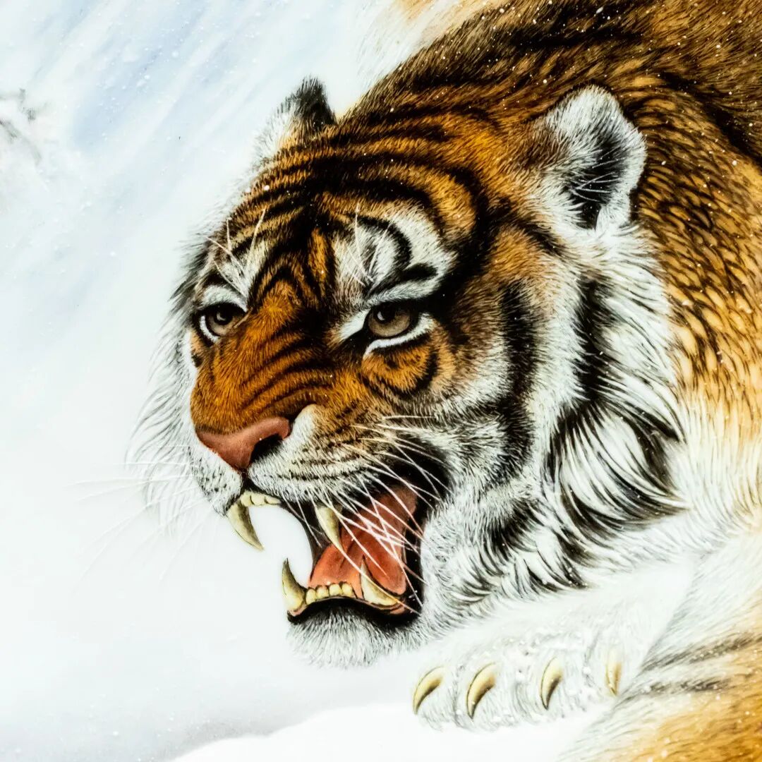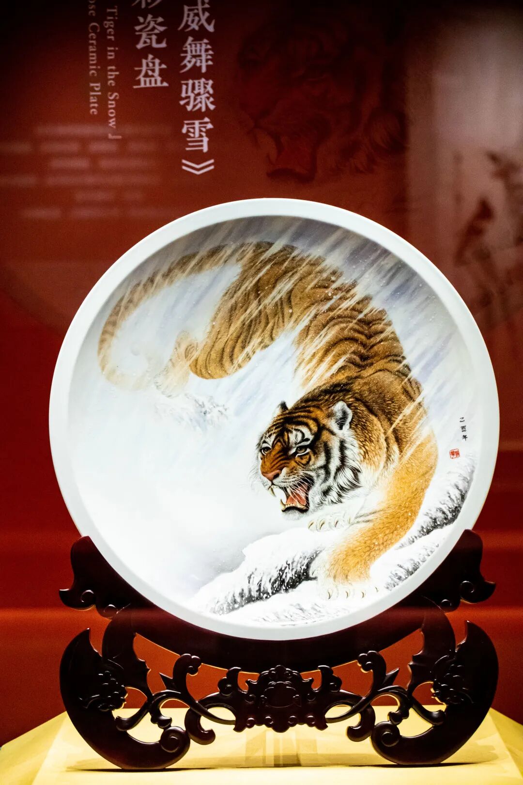 瓷盘上的虎于风雪中下山,身姿威猛,雄风凛冽,王者之气扑面而来。皮毛紧绷、肌肉鼓胀、颈毛竖立,表现 出咄咄气势。