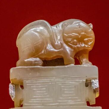 此件白玉质地,上部雕一立虎,前腿直立, 后腿弯曲,呈蹲踞状,下部为一兽面纹玉钺。《广 雅》记载:“钺,斧也。”“斧”与“府”“福”谐音,与瑞兽虎搭配,吉祥寓意更为丰富,如“府上有龙”或“府(福)上有兽(寿)”等,为清代玉雕 常见题材。