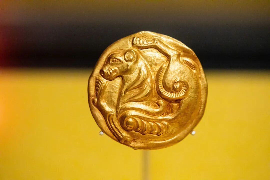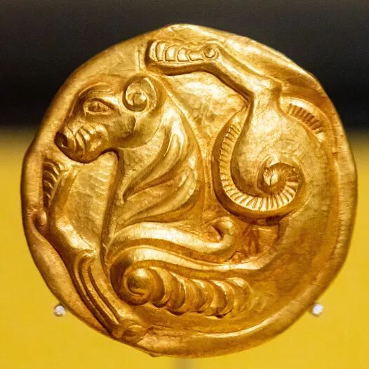 牌饰由圆形金片压模而成, 工艺成熟,纹饰清晰。虎的身体呈半浮雕状,饰有飞翼,后肢反转,整体卷曲成圆形,带有典型的中、西亚游牧民族装饰风格。