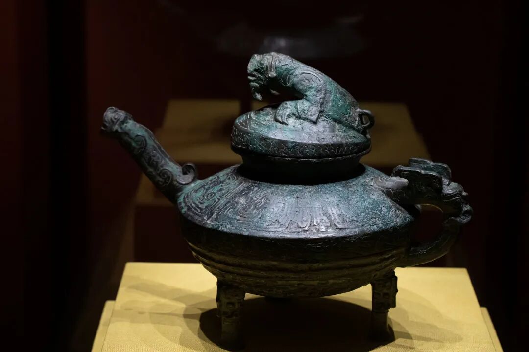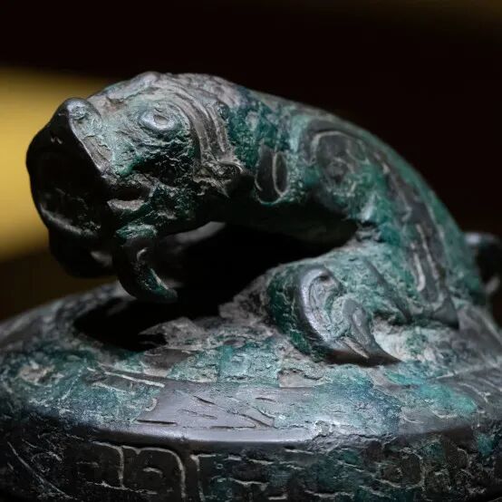 此器折肩罐腹,鋬(pàn)塑龙首,顶加饰虎纹,盖顶踞一虎身龙尾兽。因流管饰卧虎形象,故称“虎鎣(yíng)”,可能为祭祀、宴飨等典仪中用器。