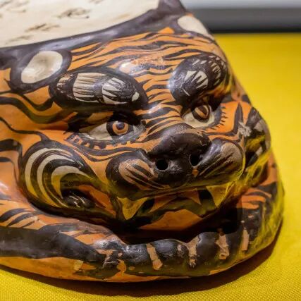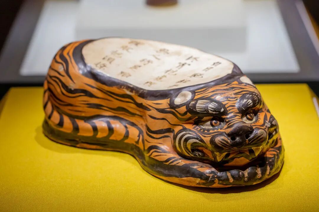 瓷枕为卧虎造型。虎面张目露齿,虎身以黄釉为地,上施黑色毛皮纹和尾部花纹。虎背削平为椭圆形枕面,上有诗句:“白日驼经卷,终宵枕虎腰。无人将尾蹈,谁敢把须撩。”