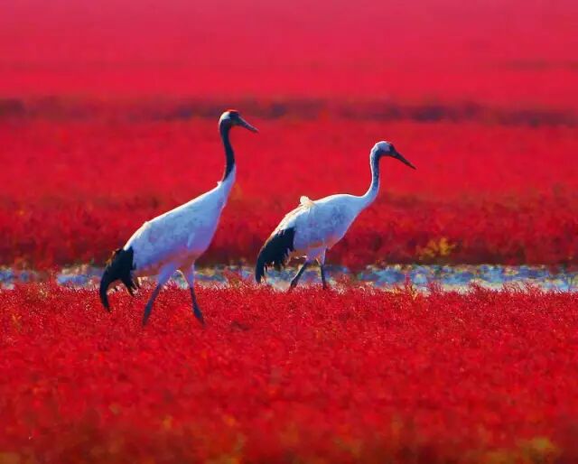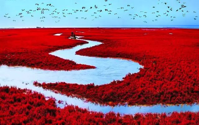 盘锦红海滩位于渤海湾东北部,这里是丹顶鹤繁殖的最南限,也是世界珍稀鸟类黑嘴鸥的主要繁殖地。无垠的苇海里栖息着二百六十余种数十万只鸟类。织就盘锦红海滩的是一棵棵纤弱的碱蓬草--即一种适宜在盐碱土质--也是惟一一种可以在盐碱土质上存活的草。每逢11月初种子完全成熟。深秋成熟时植株火红,热烈如火,鲜艳欲滴。