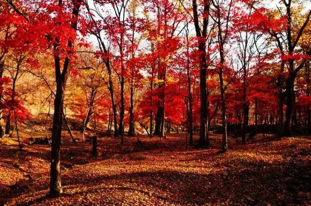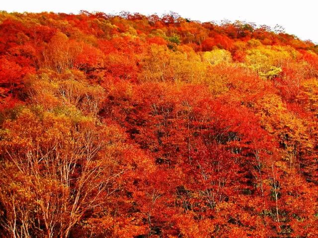 北京香山每到秋天,漫山遍野的黄栌树叶红得像火焰一般,霜后呈深紫红色。这些黄栌树是清代乾隆年间栽植的,经过200多年来的发展。绝佳处在森玉笏峰小亭,从亭里极目远眺,瑟瑟秋风中,似红霞排山倒海而来,整座山似乎都摇晃起来了,又有松柏点缀其间,红绿相间,瑰奇绚丽。