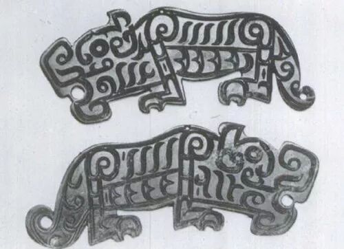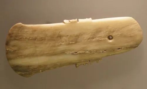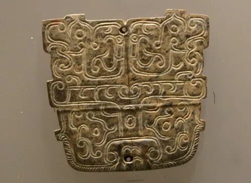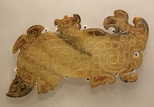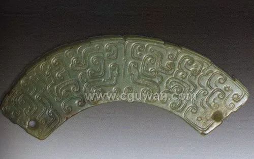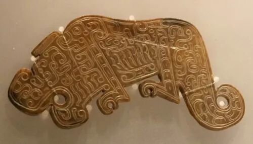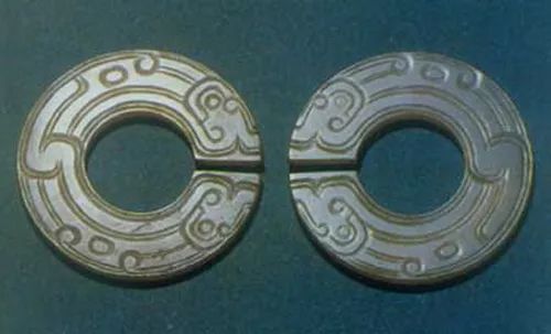 传说中的北极天神,人面蛇身。这一对人面蛇形佩有着很高的知名度,曾经被许多研究玉器的论著所引用。但其实,它们原本也是石家河文化的遗物,有四千年以上的历史。玉佩原来是一只,但是后来匠人们得到它,将其剖开为两半,于是成为一对。其中的一只,又仿照另一只进行刻绘,所以两只的刻线略有不同。据《山海经》记载,有天神名“嘘”,或者名“噎”,没有手臂,两足反弯过来放在头顶上。噎是帝颛顼的子孙,颛顼生老童,老童产重及黎,黎生后土,后土生噎,噎生一年的一十二个月。他的职责是:扭转天门(天枢)以实现人间四季的变化,所谓“天枢”,即北斗星也,四季变更,斗柄指向不同的方位。当然,这个蛇形佩虽然无臂,却也无足,莫非两足合并,成了蛇形。现在大家可以猜一猜,这两只佩,哪一只是原版,哪一只是后来仿刻的?