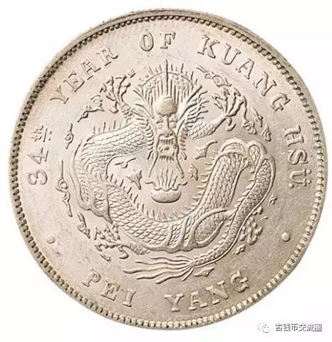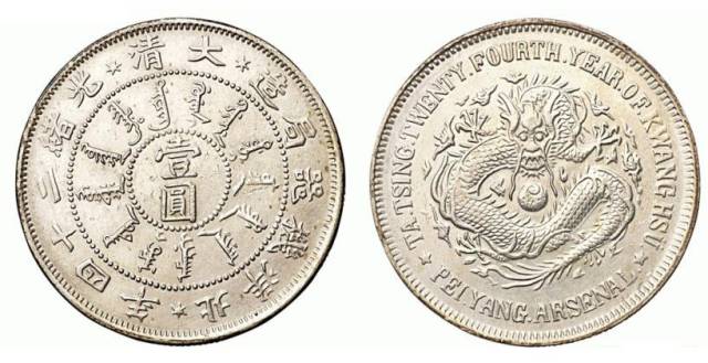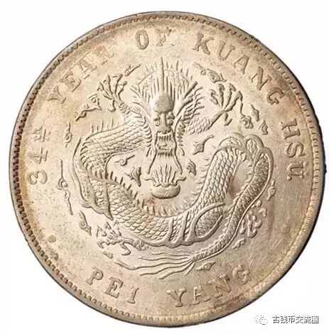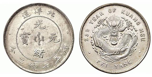 1899年4月,清政府想收回铸币权,后来经荣禄的极力保留,6月份,清政府又准许北洋机器局继续铸造银元,但是,至此以后北洋铸造银元总局,所铸造的银元,改为北洋造。有25年,26年,29年,31年,33年,34年版数种。他们的龙纹图案特征自成一个系列。