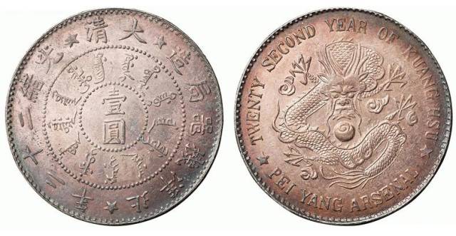 1896年7月,北洋机器局试铸出了一套五种币值的银元,这五种分别为二十二年一元,五角,二角,一角和五分,主币为一元。