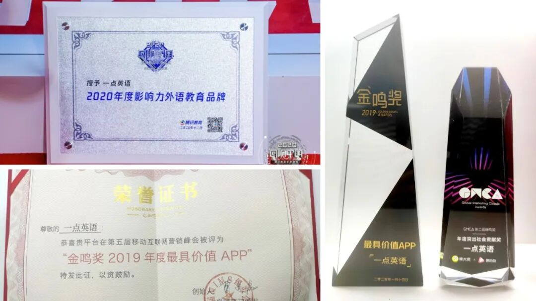 他们之中,还有澳洲国家级专业同传译员、海外知名大学英语讲师、TESOL国际英语教学持证教师……在过去的2020年,一点英语凭借过硬的实力和用户的高度认可,斩获多个奖项。