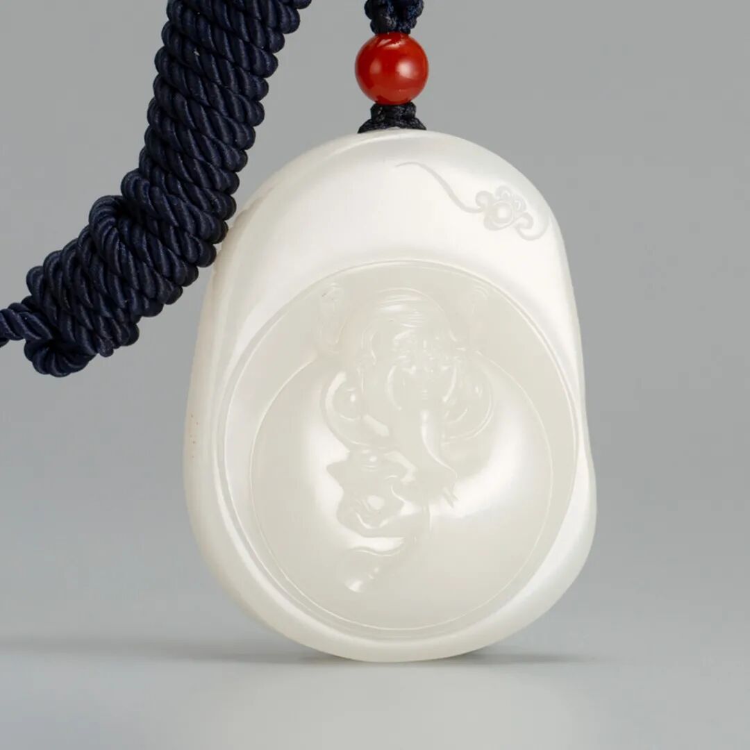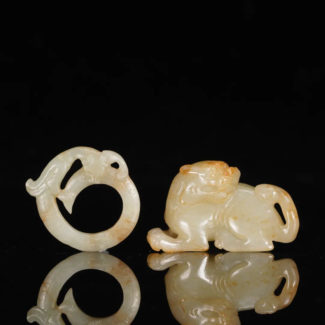 玉雕包浆浑厚,局部带沁。龙型玉佩身体卷曲,呈圆形片状,龙首略宽,穿孔供佩戴。瑞兽呈回首状,雕工精细,形象逼真,作摆件颇具灵气。