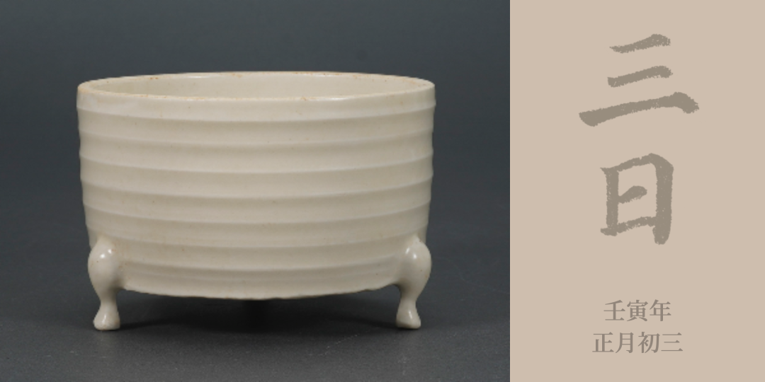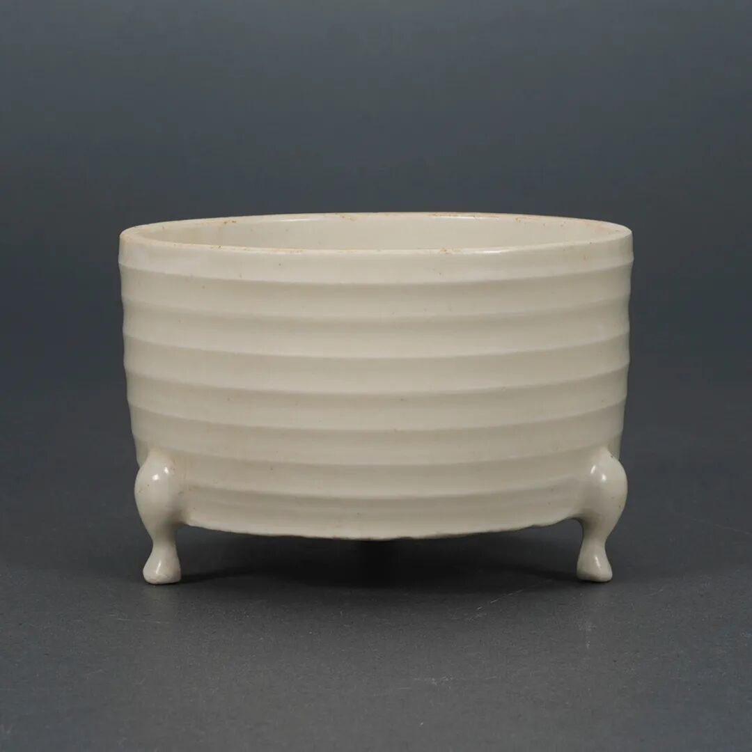 此炉形制古雅,线条流畅。通体满施白釉,釉层肥腴,通体光素,仅以出筋手法饰弦纹数道,底承三足,置于案头陈设,为文房清供佳品。