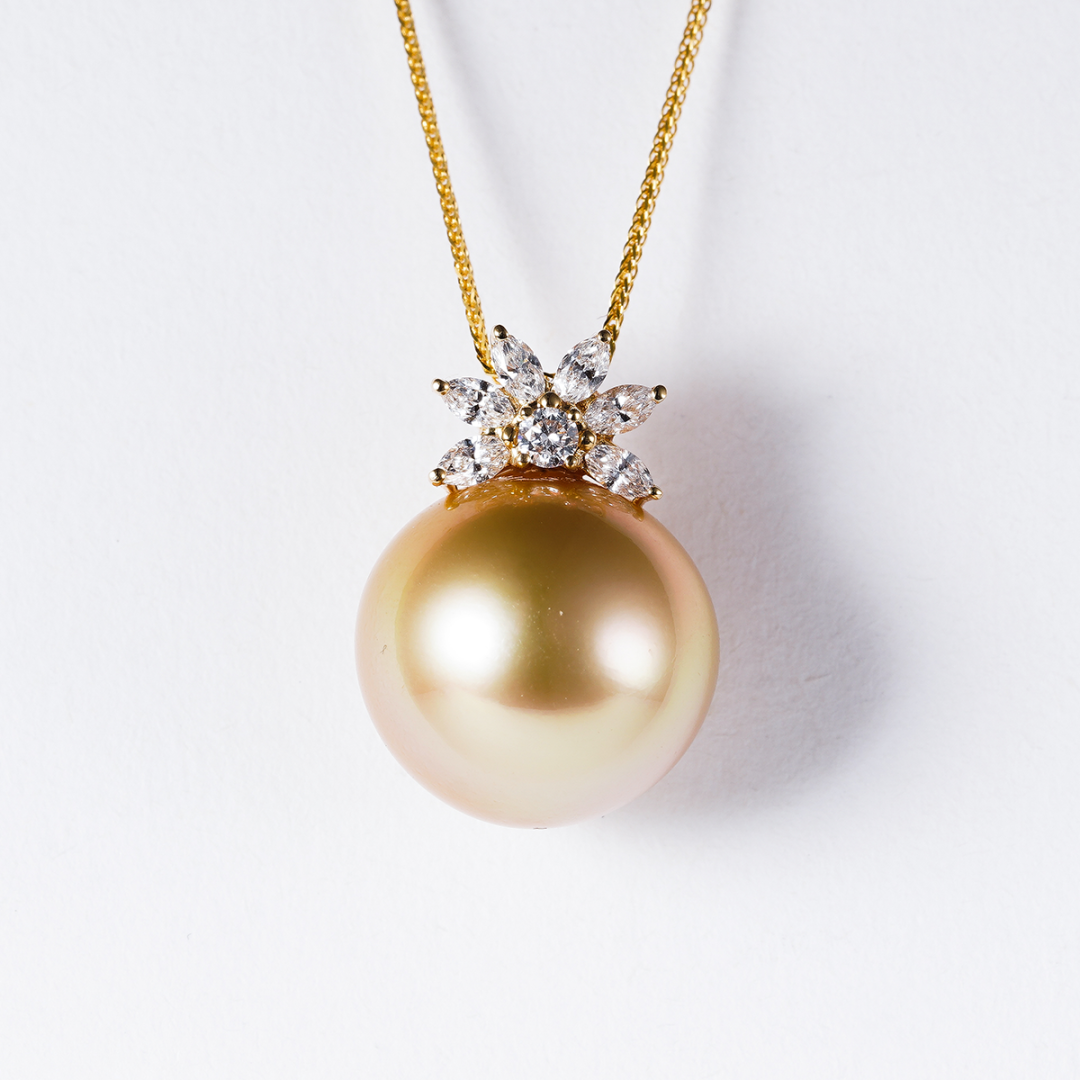 18K金镶嵌17mm海水金色珍珠,配镶0.452克拉钻石点缀。金珠色浓郁靓丽,圆度优良,仅有天然生长痕迹,搭配钻石花形扣头,整体造型简约。
