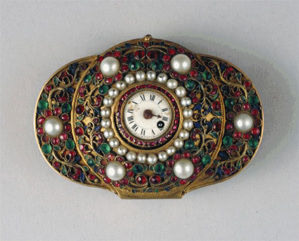表镶带扣上,铜镀金质地,正面用铜丝镶出花叶纹样,再在花纹中嵌珍珠和红绿蓝色料石。小表放在带扣主体中间的凹槽中,上面用中空的盖扣紧固定,打开盖,可以将小表取出。小表为单针,从表盘上上弦。带扣后面有两个穿孔,可以将其穿附在带子上,是一件实用性的小表。