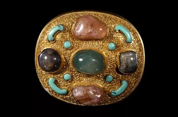 这些嵌宝石的带头、带钩,宝石材质多样,可大多采用随形镶,可底座的黄金纹饰却雕琢得极为精巧,展现出中国古代手工艺的精细。金、玉、玛瑙、以及各色宝石互相映衬,展现出沉甸甸的文化积淀。