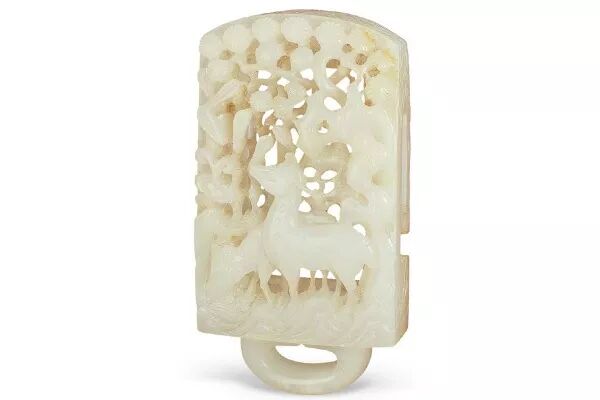 略呈扁平长方体,正面微弧凸,以多层镂雕技法刻画松溪双鹿图景,画面满密紧凑,主次分明。值得注意的是,此器在下层纹饰的磨制上相当讲究,这是很多同类作品所不能比拟的。背面为四边粗框,侧边有长方穿孔,以供革鞓穿插。下部有一椭圆形环,可系挂什物。