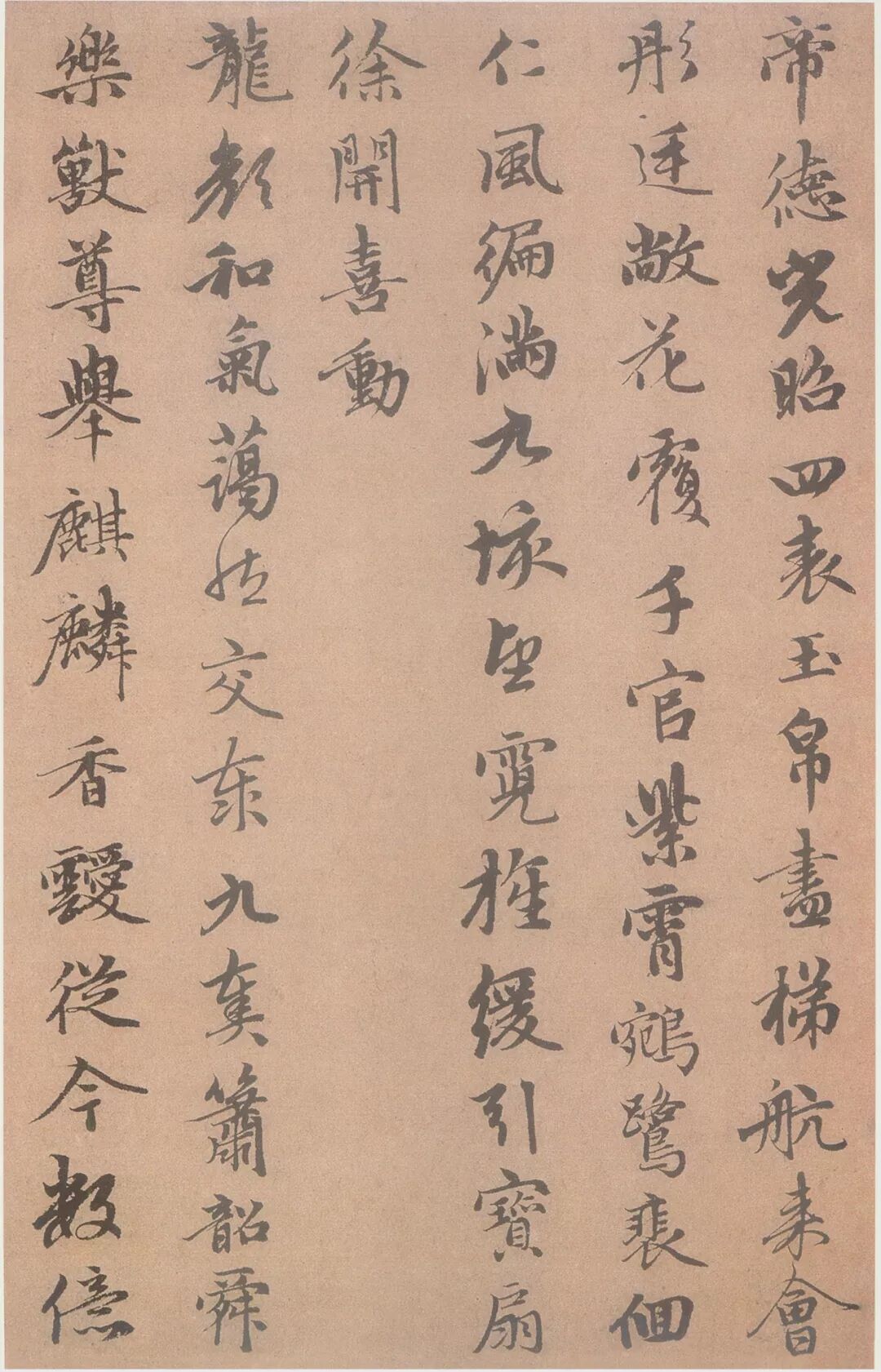 帝德照光四表,玉帛尽、梯航来会。彤庭敞,花覆千官,紫霄鹭徘徊。仁风遍满九垓。望霓旌缓引,宝扇徐开。喜动龙颜,和气蔼然交泰。九奏箫韶舜乐,兽尊举、麒麟香{?}。从今数,亿