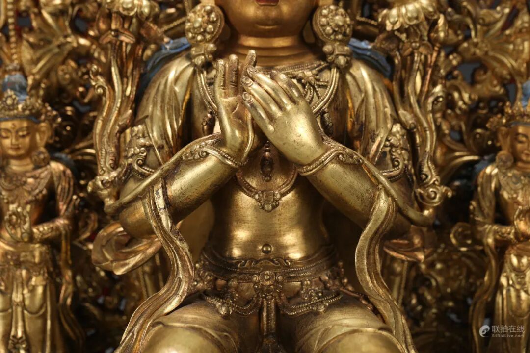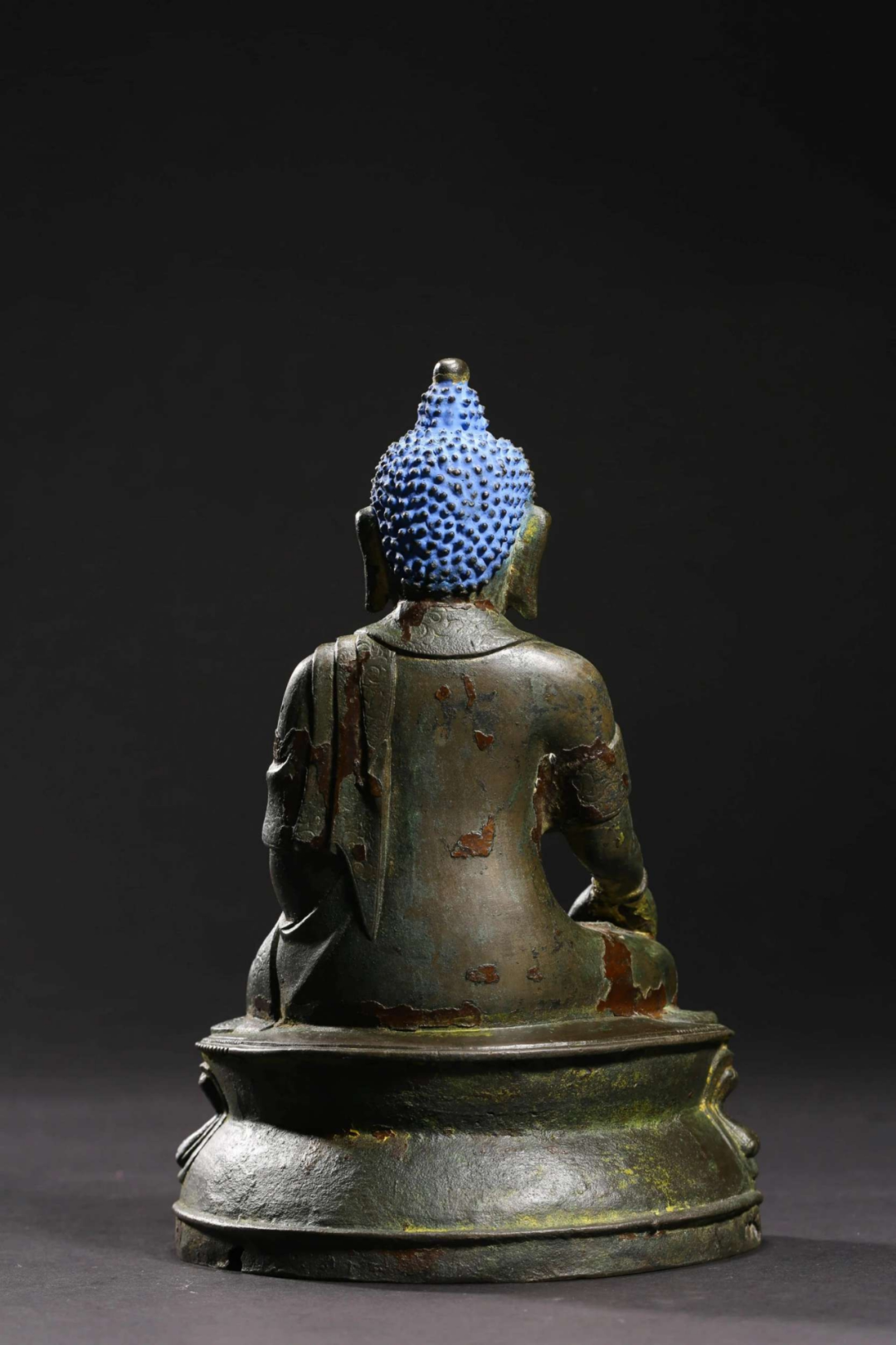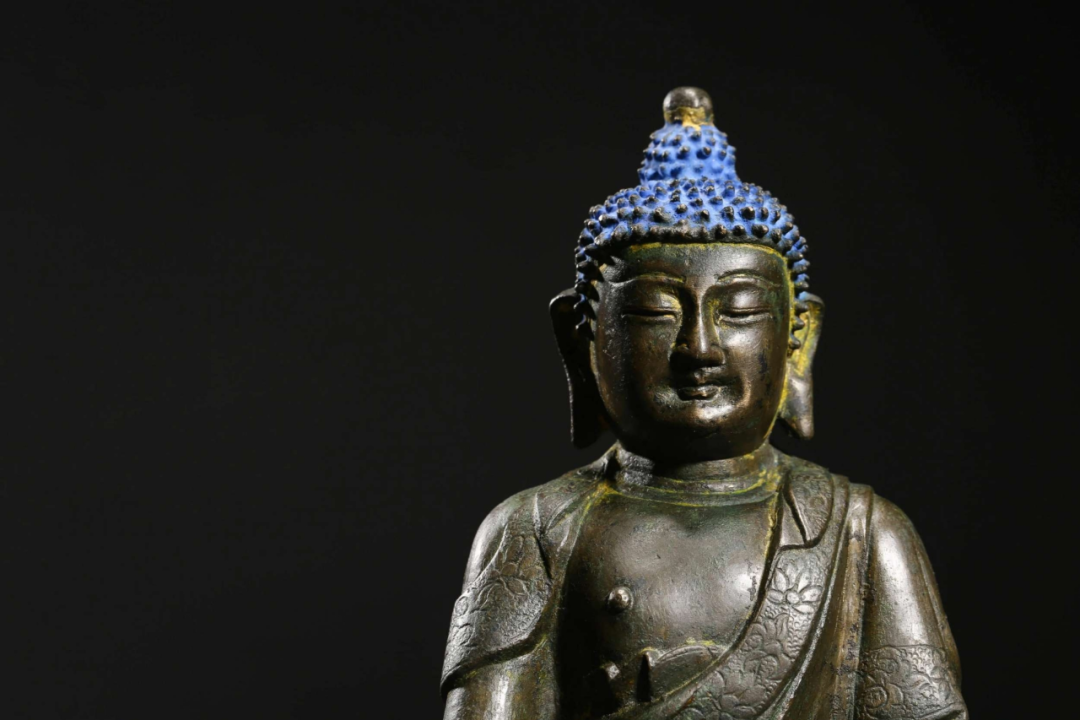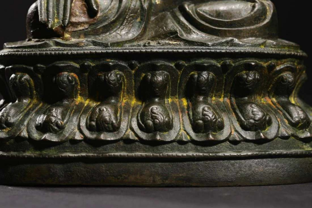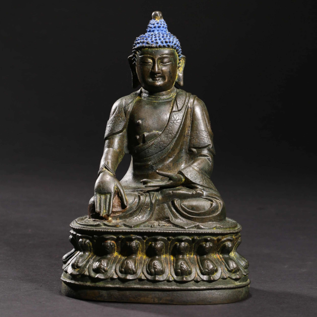 鉴定意见:释迦牟尼佛成道像。面相端庄,如法如仪。莲辨,衣纹等线条刚劲有力。局部残留着当年漆金的痕迹,属于冷金技法。从莲座的背后看,有一部分省略了,是明代中晚期莲瓣的普遍做法。整体造型端庄,比例匀称,刀工刚劲流暢。底胎铸造方法合理,是明代中期北方地区的作品。约相当于明代成化嘉靖时代所造。值得收藏。