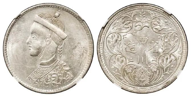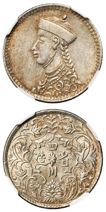 简介:1902-1911年四川省造第一期光绪像一卢比银币一枚,Y-3.2/LM-359,有领直花“四”上无叶版,铸造精美,银光姣好,NGC MS64,目前为该公司评级纪录第二名。