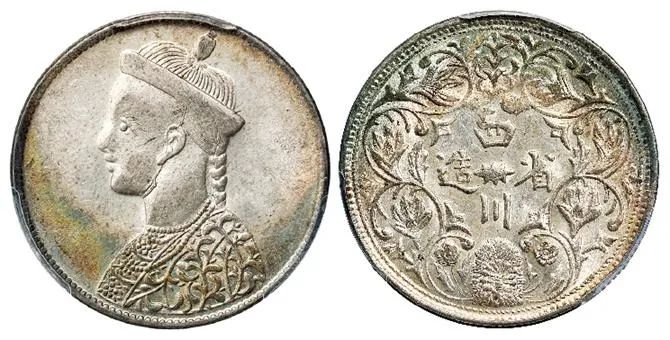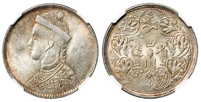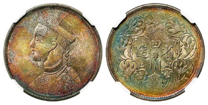 简介:1902-1911年四川省造第一期光绪像一卢比银币一枚,Y-3.2/LM-359,有领直花“四”上无叶版,绚丽五彩包浆,NGC MS62。