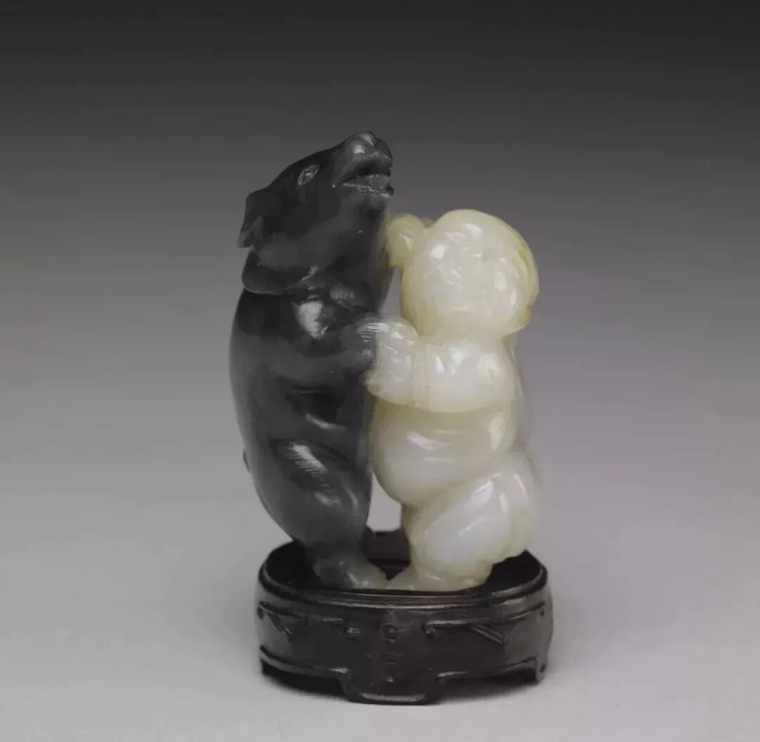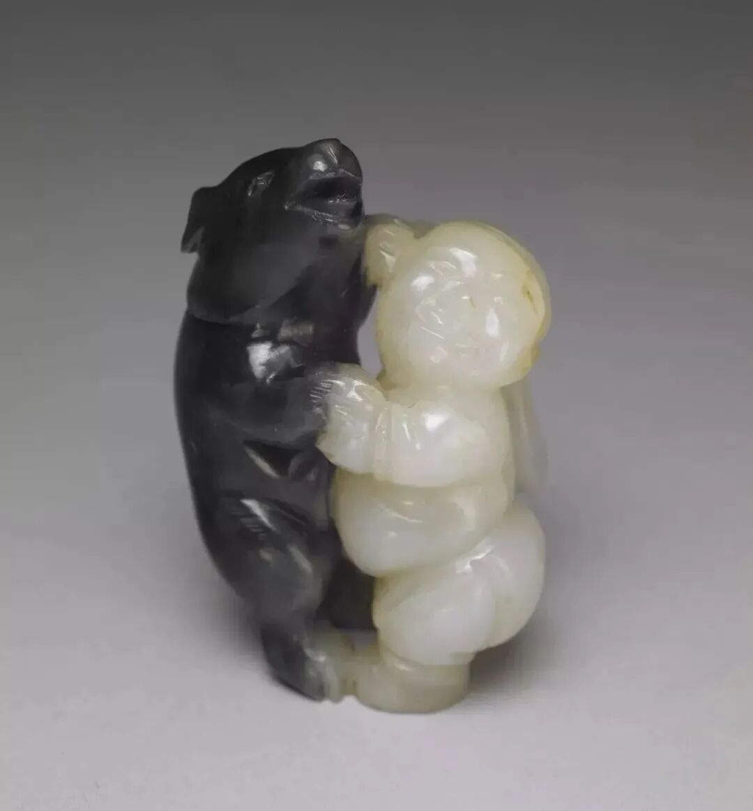 利用天然黑白两色玉石,以长线条雕出白玉人浑圆壮硕的体型;以短线阴刻黑玉熊毛茸茸的身躯。工匠以慧心巧思,雕出人与熊角力的瞬间。那一瞬间,不是紧张的肉搏,而是玉人与熊都笑了,手牵手地翩然起舞。此件玉雕,与其他小件古玩,贮于百什件中,显示百什件所收多为精巧好玩之物。