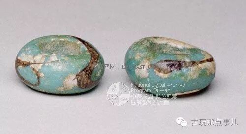 春秋(公元前770-前476年)大者直径1.2厘米,长2.21厘米;小者直径0.6厘米,长0.9厘米1988年太原市金胜村赵卿墓出土 共13枚,依其形制大小可分为三种,纹饰及质地相同,浅绿色底,球形,两端略平,中一圆孔。器表镶嵌白边深蓝圆点,酷似蜻蜓眼。制作精致,色彩绚丽,图案鲜明,光彩夺目。