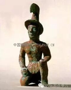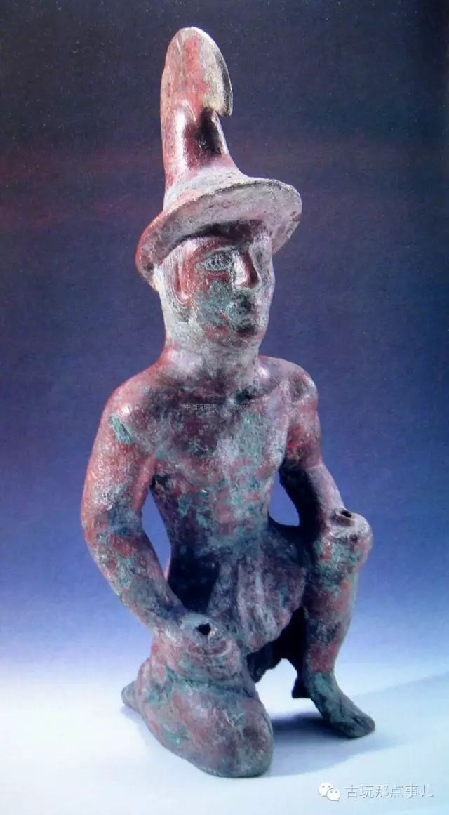 1981年新疆新源县七十一团渔场墓葬出土了一件约公元前500年的古希腊战士青铜器。战士头戴遮沿高顶帽, 顶端向前卷曲。高鼻,阔嘴,上身裸,腰结短裙。