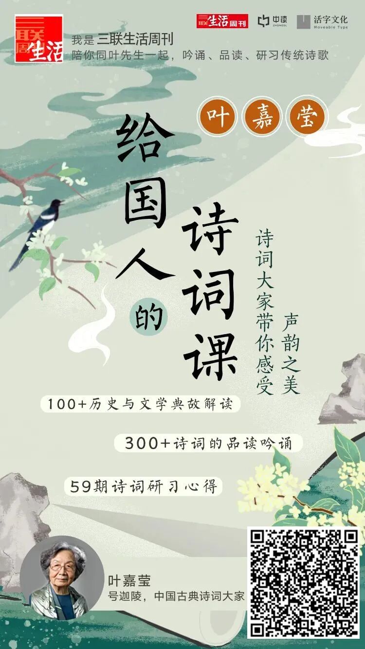 “我想在我离开世界以前,把即将失传的吟诵留给世界,留给那些真正的诗歌爱好者。”现在,古典诗词研究学者叶嘉莹的《叶嘉莹·给国人的诗词课》音频专栏在三联中读上线了!不同于简单的读诗,叶先生将系统地讲解诗词吟诵之法,精选249首唐宋古诗和86阕宋词元曲,从声韵之美的欣赏,到诗词内涵的品读,完成我们对诗歌灵魂真味的兴发感悟。点击下方“阅读原文”,即可订阅《叶嘉莹·给国人的诗词课》。