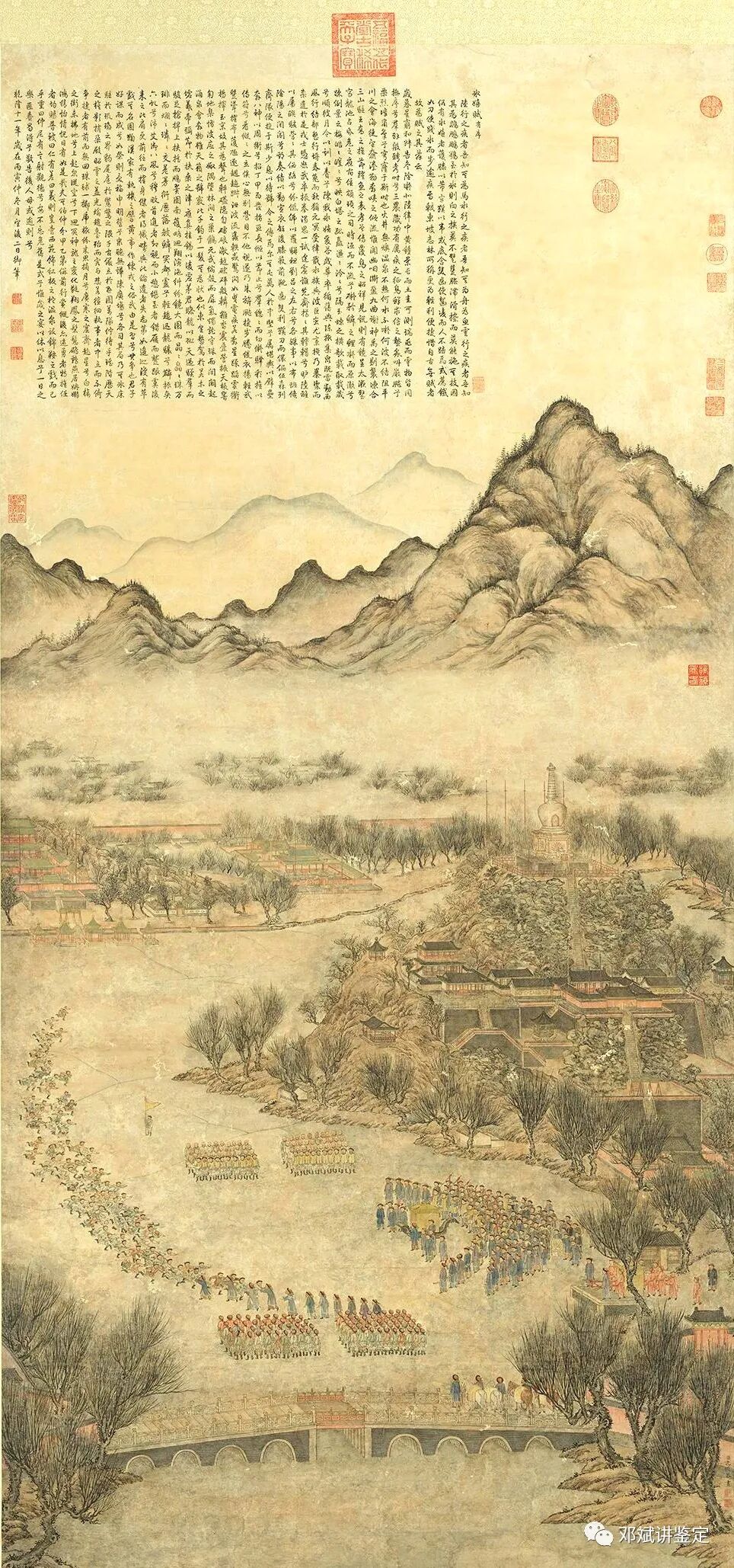乾隆帝于落款处题:“乾隆十一年岁在丙寅仲冬月雪后二日御笔。”另据内务府造办处档案,此画极有可能在乾隆帝御笔书赋之后于当月装裱。